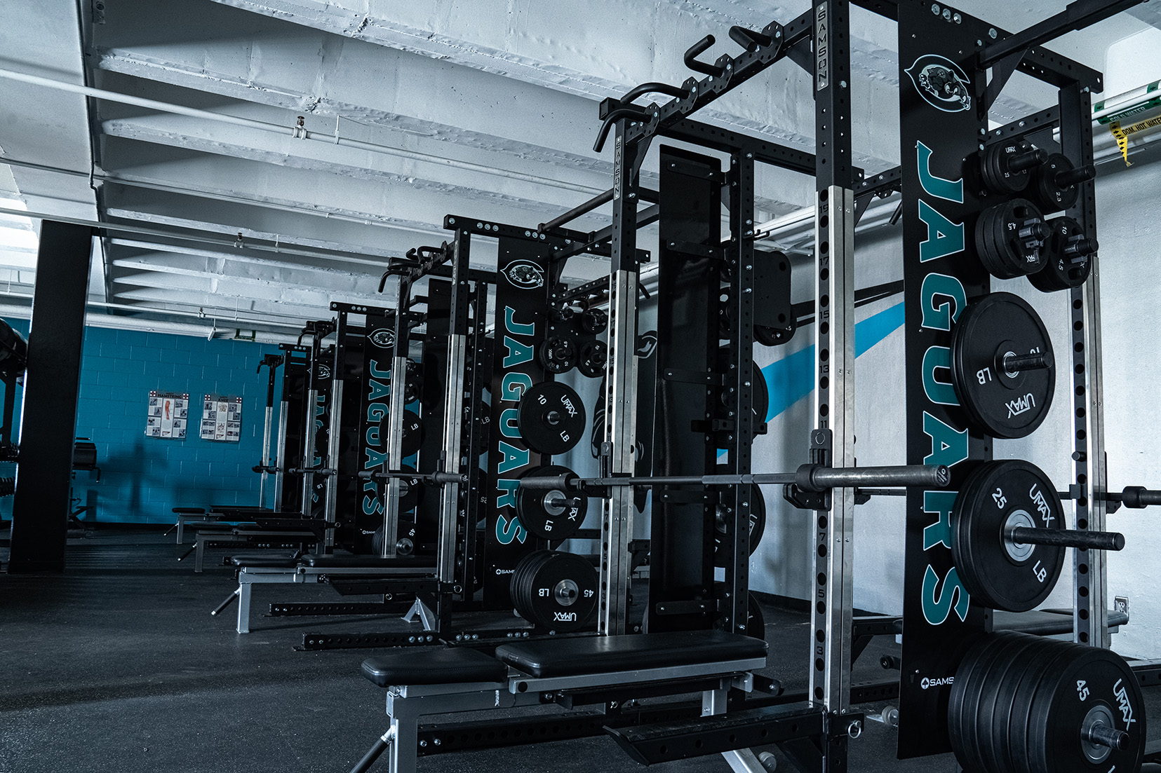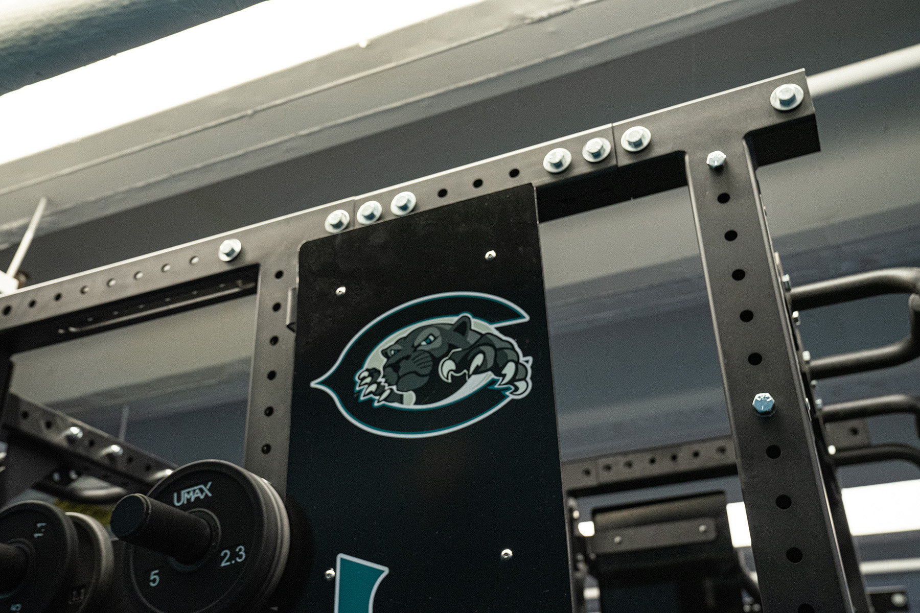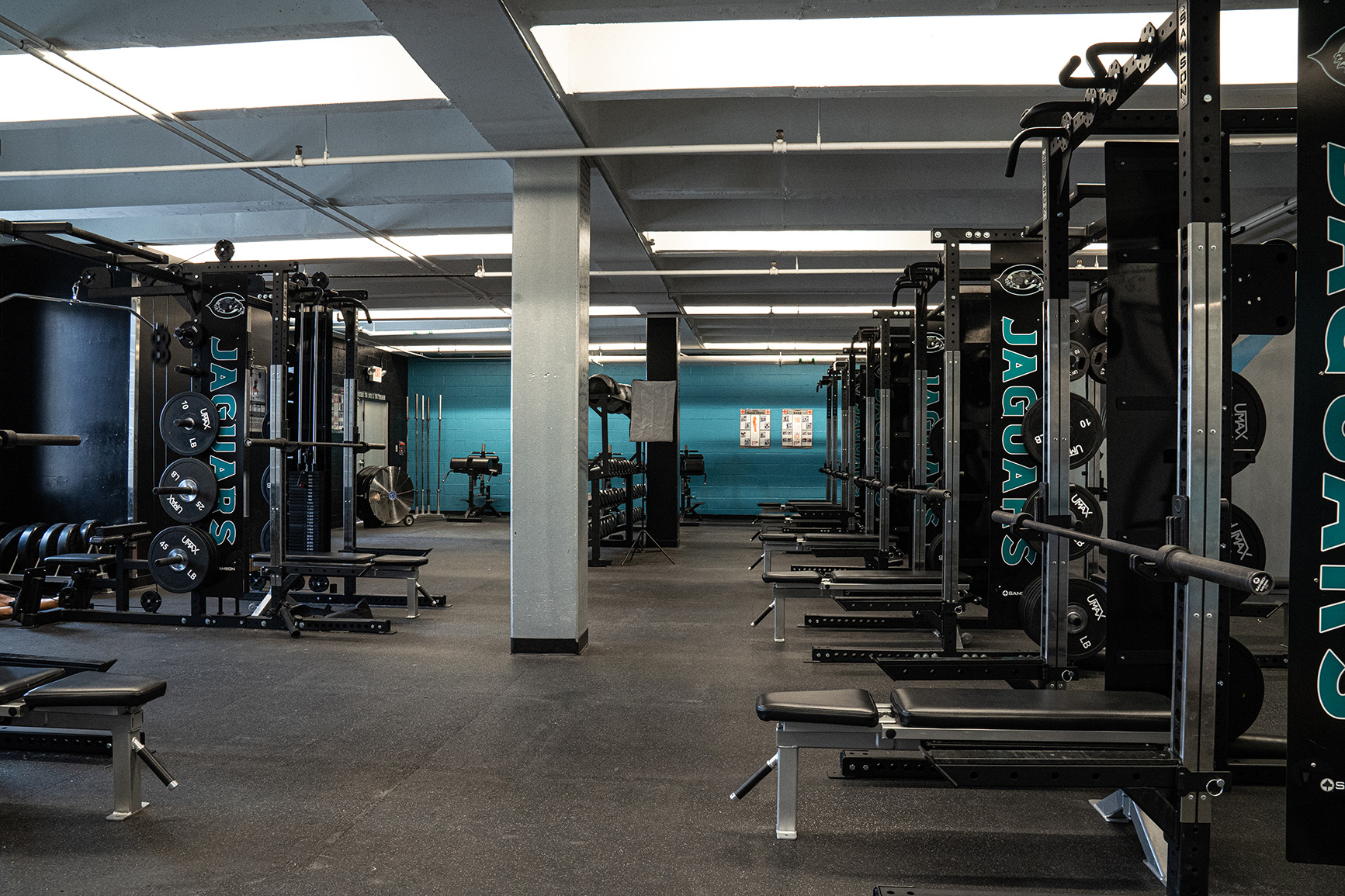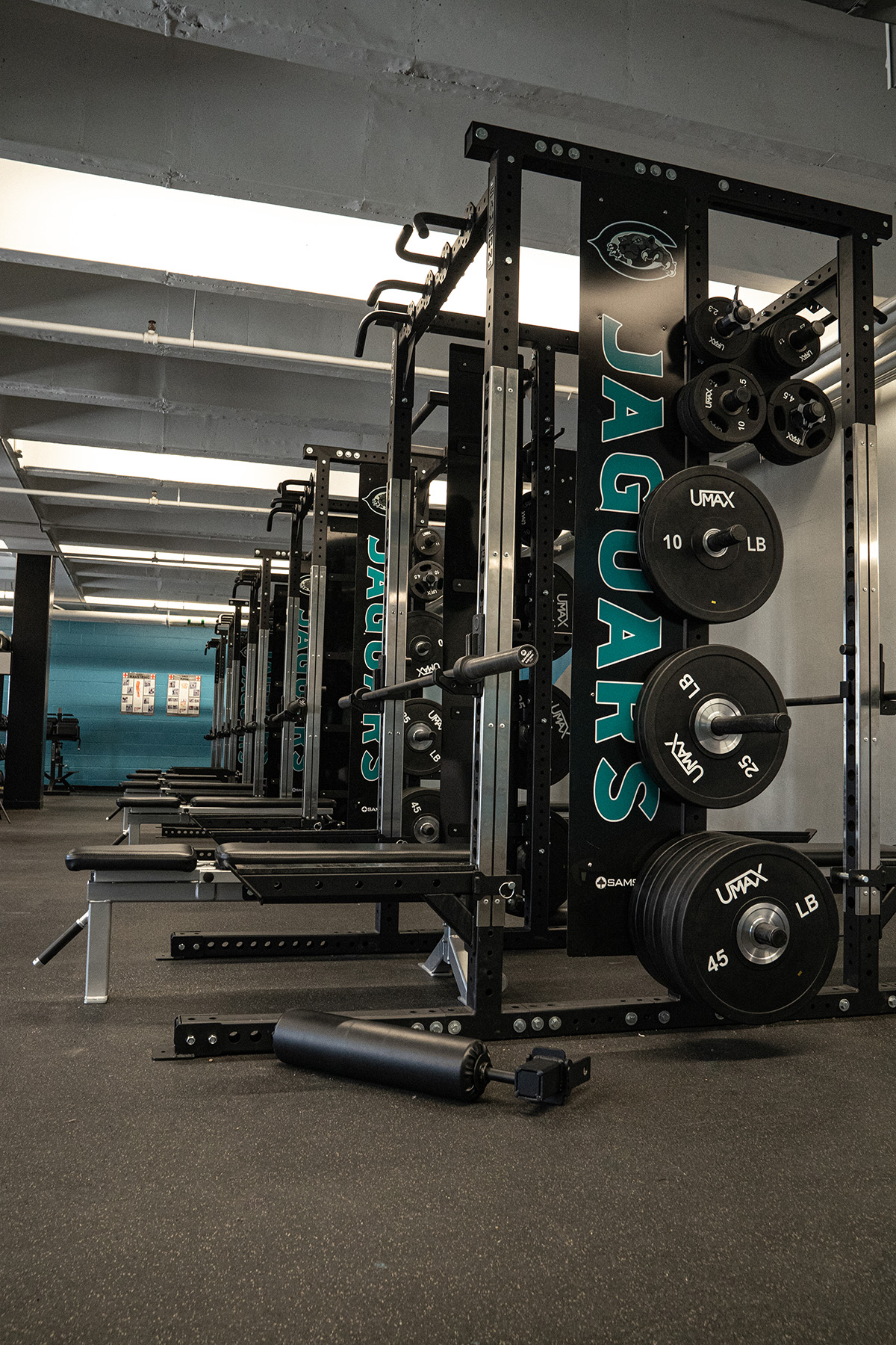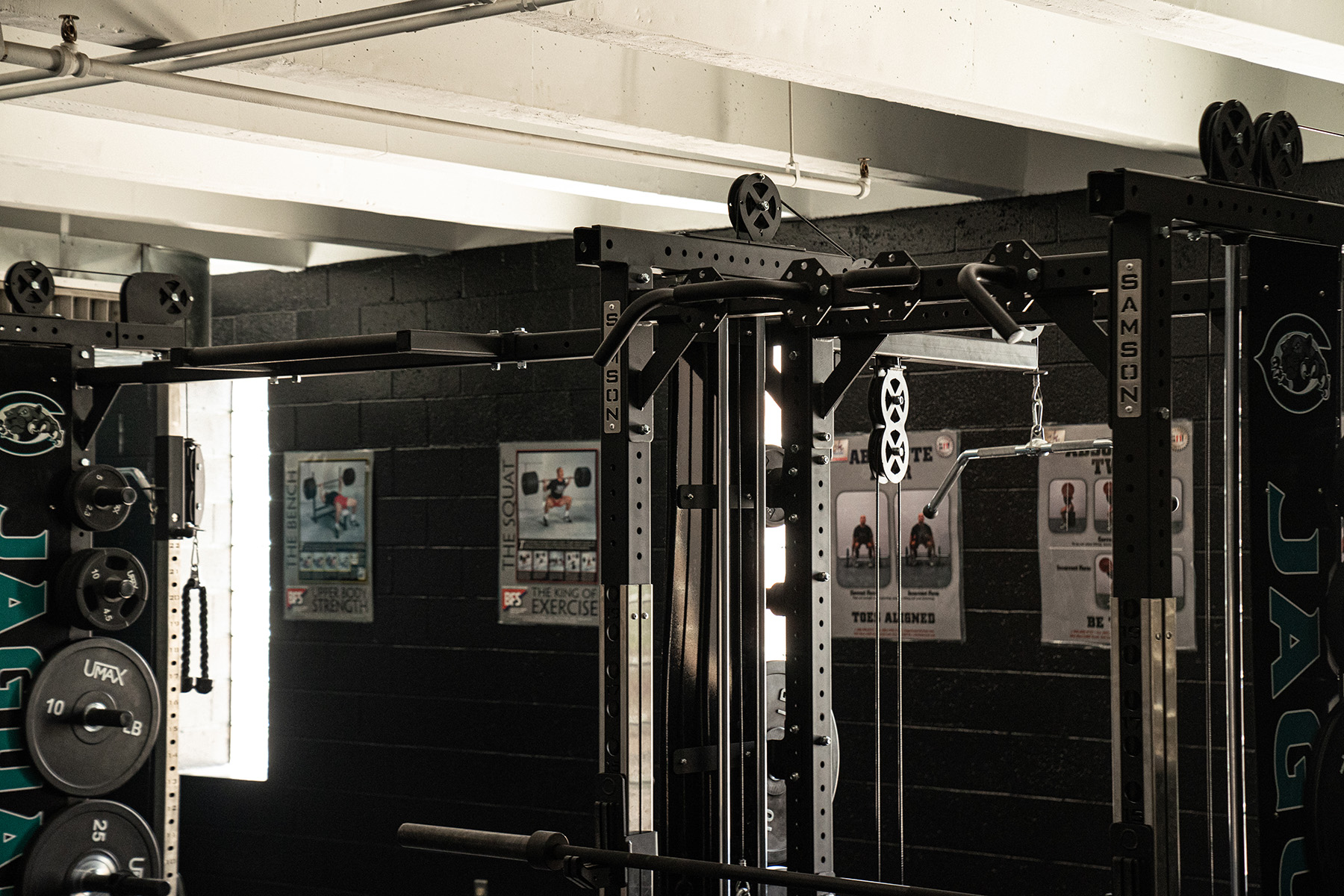 The Capital High School Jaguars refinished weight room features two Samson Flex-Rack Functional Training Rack (FTR) Combo Stations and five Double-sided Flex Rack stations all equipped with Samson Combo Benches. The Jaguars now have a total of 12 lifting stations, two fully adjustable cable columns and two lat-row combo machines. This weight room features a posterior chain area with four Glute-Ham Developers and team branded graphic shields.
