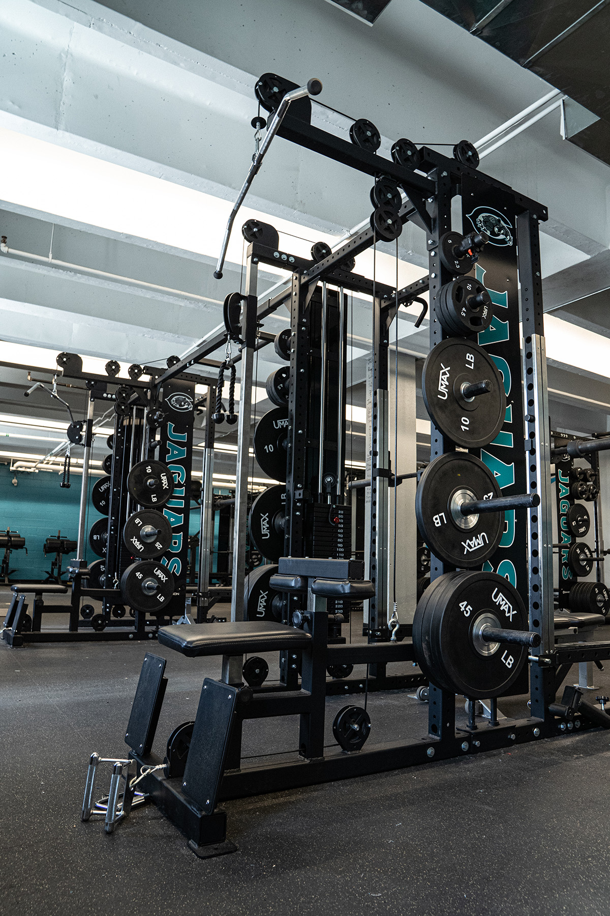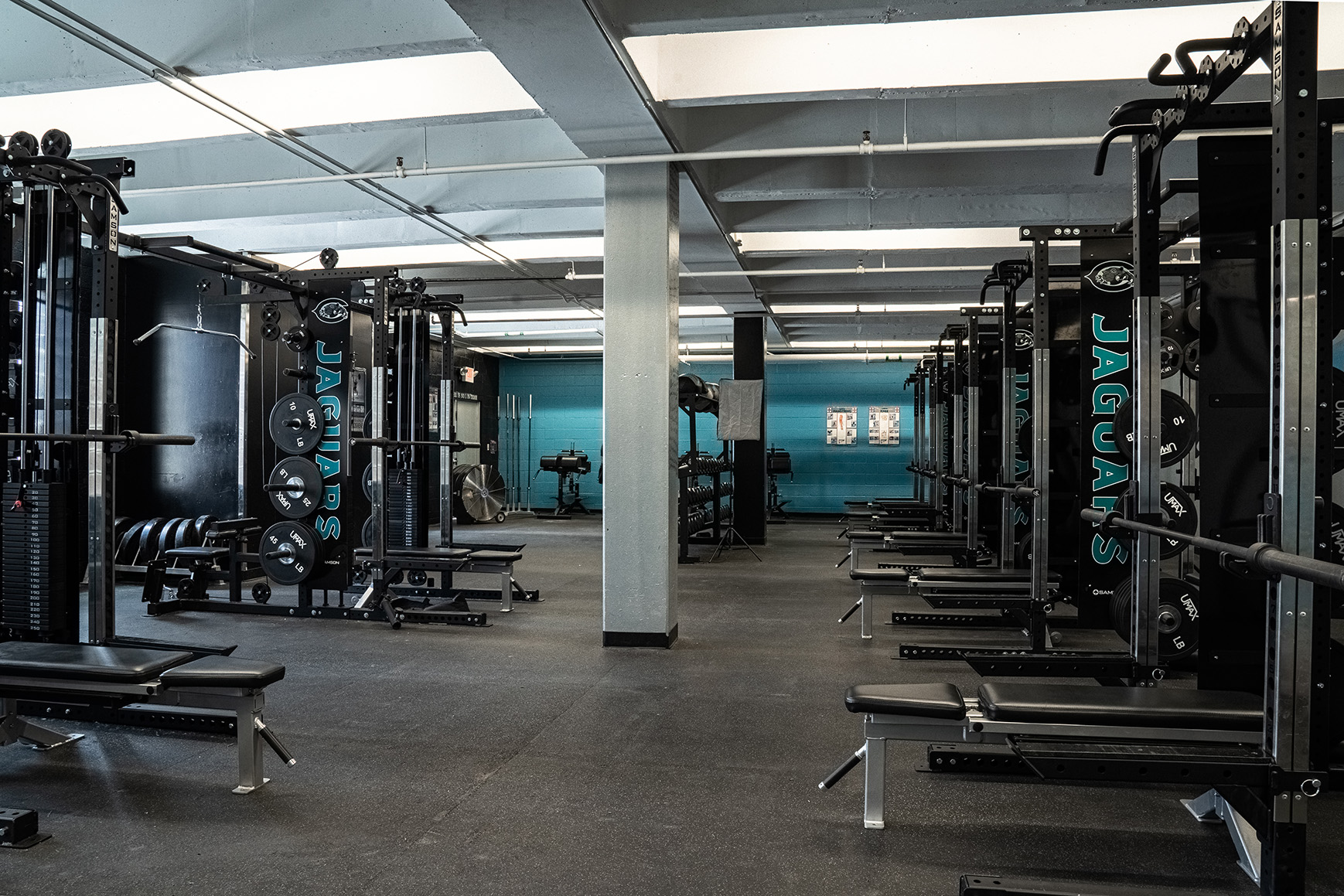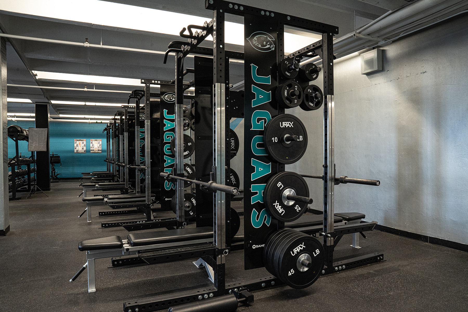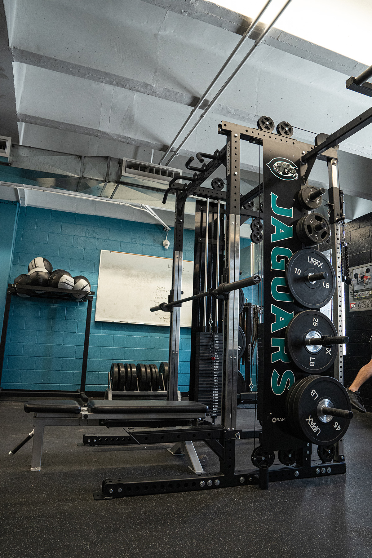 The Capital High School Jaguars refinished weight room features two Samson Flex-Rack Functional Training Rack (FTR) Combo Stations and five Double-sided Flex Rack stations all equipped with Samson Combo Benches. The Jaguars now have a total of 12 lifting stations, two fully adjustable cable columns and two lat-row combo machines. This weight room features a posterior chain area with four Glute-Ham Developers and team branded graphic shields.