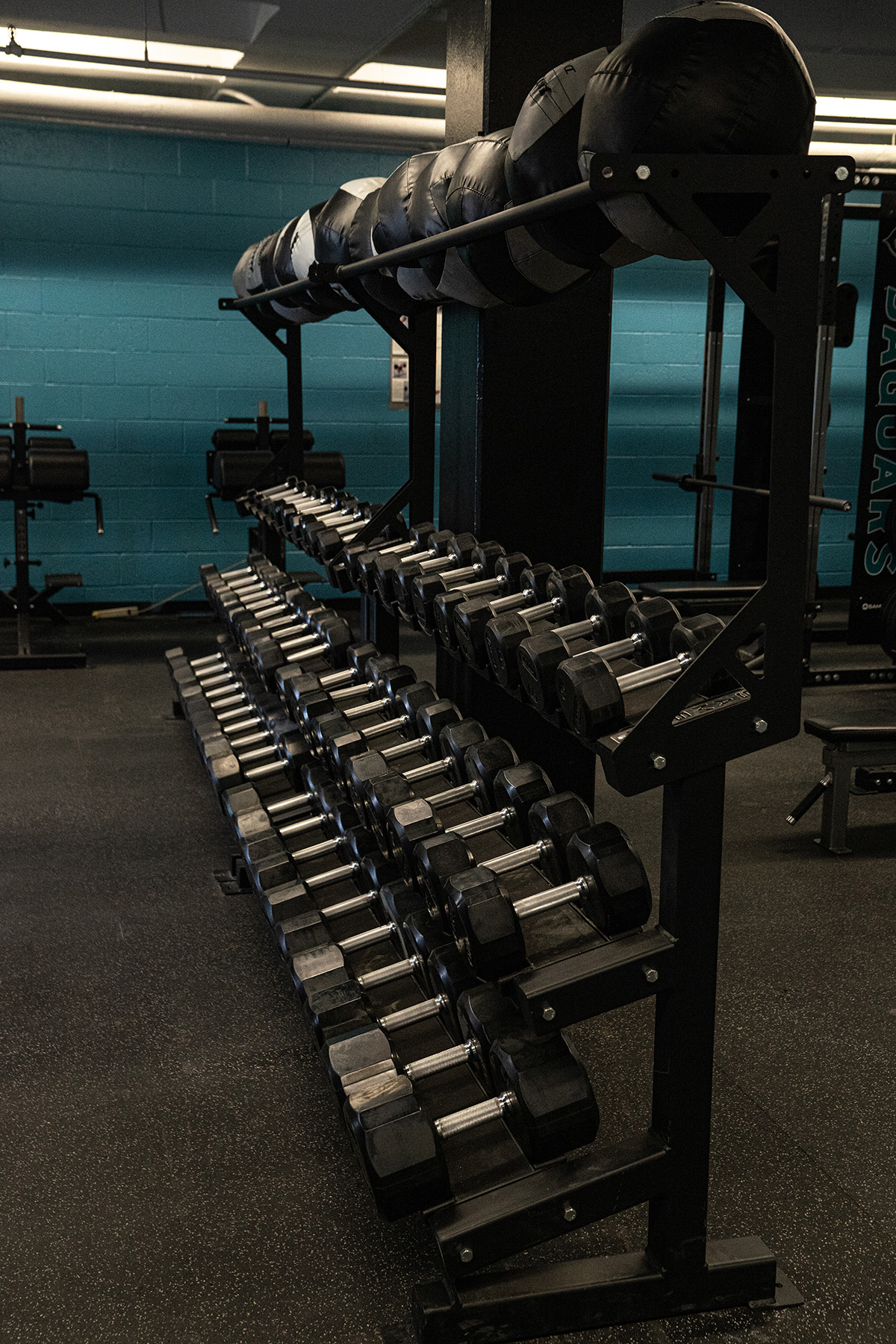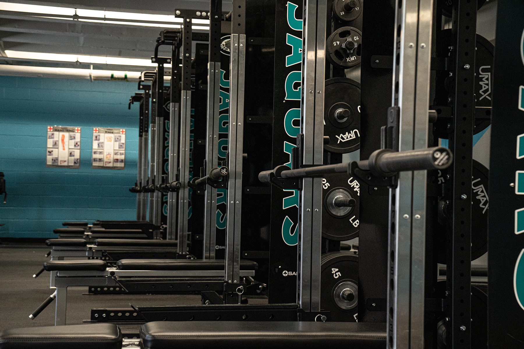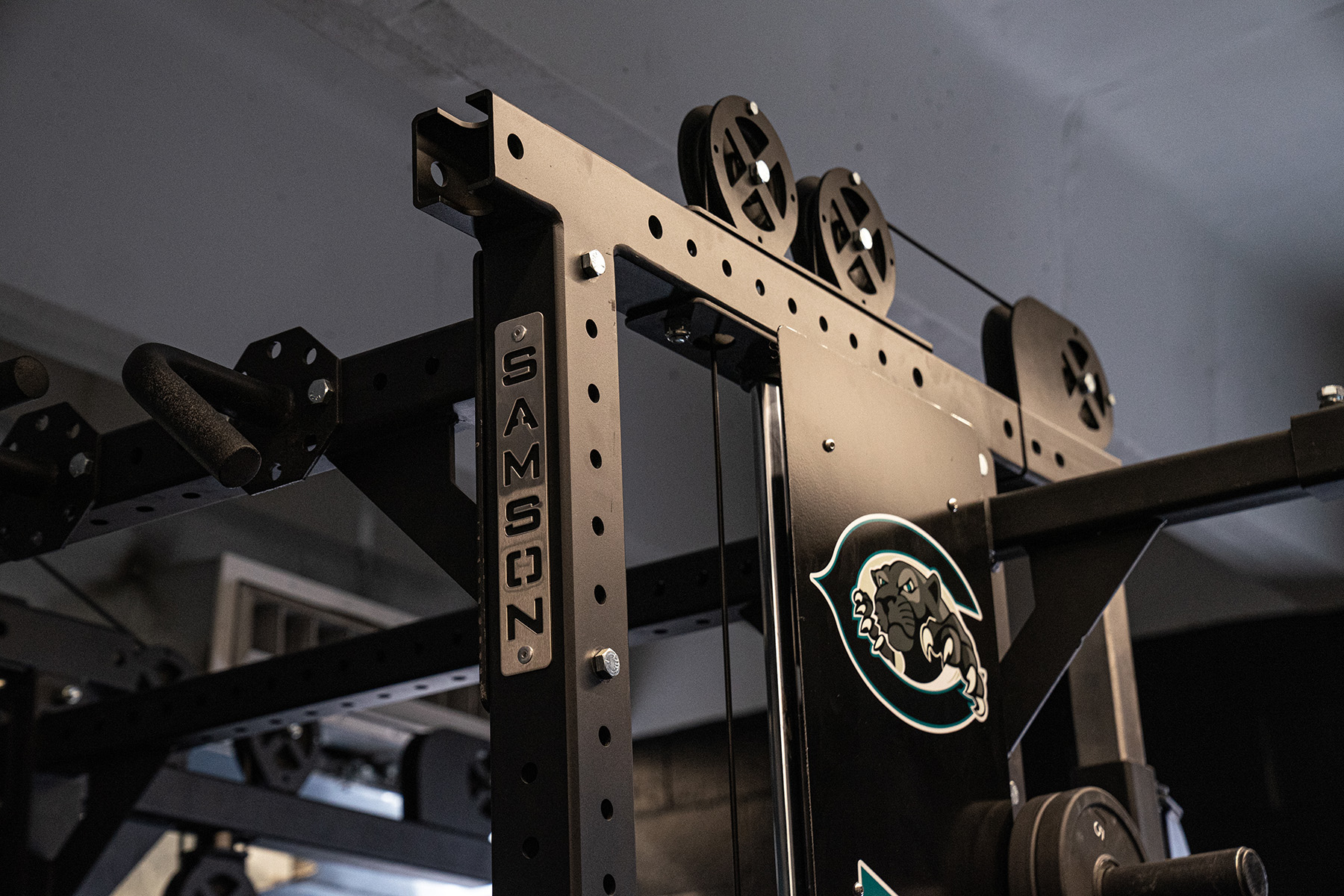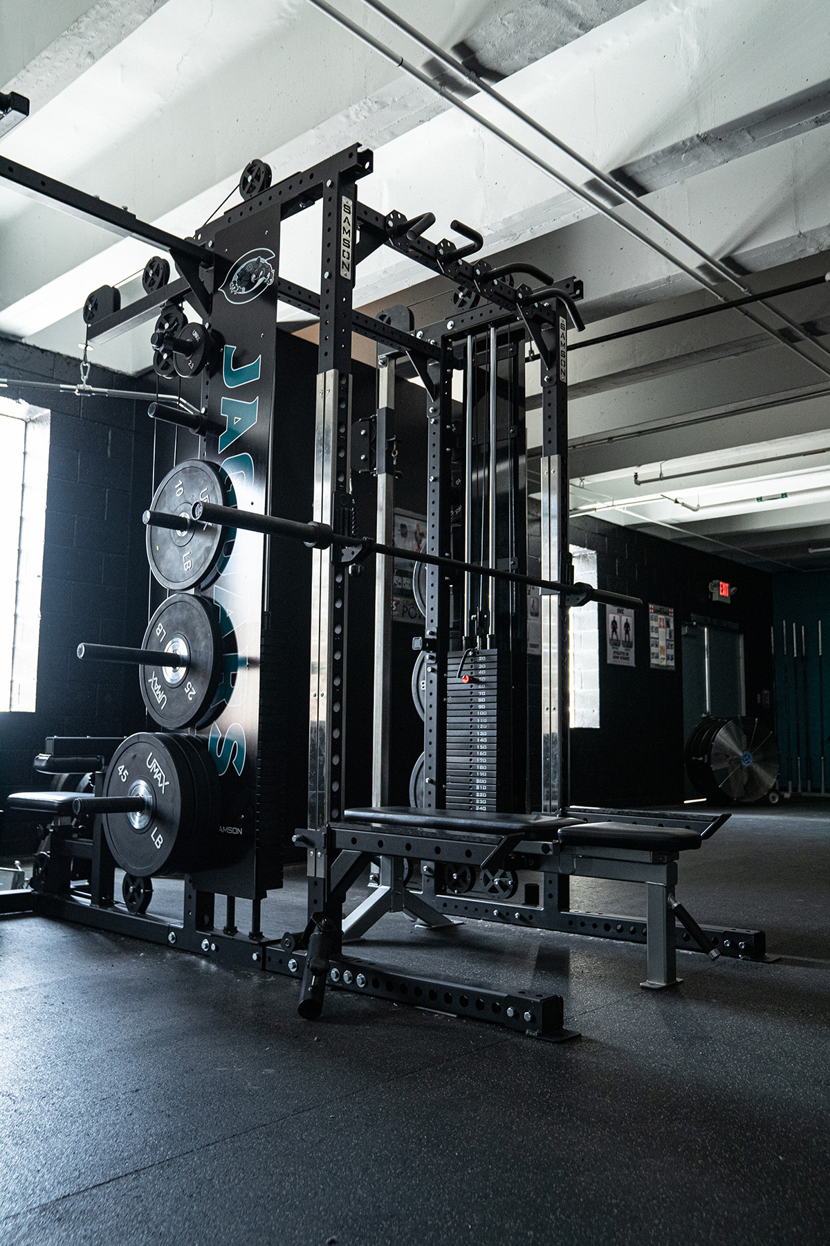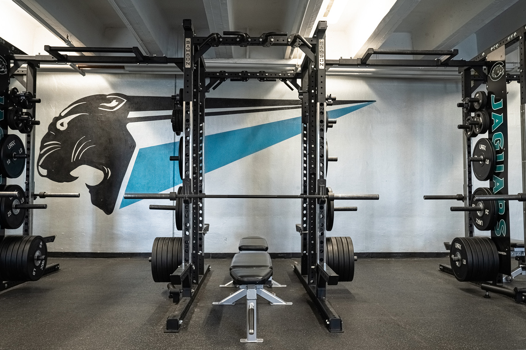 The Capital High School Jaguars refinished weight room features two Samson Flex-Rack Functional Training Rack (FTR) Combo Stations and five Double-sided Flex Rack stations all equipped with Samson Combo Benches. The Jaguars now have a total of 12 lifting stations, two fully adjustable cable columns and two lat-row combo machines. This weight room features a posterior chain area with four Glute-Ham Developers and team branded graphic shields.