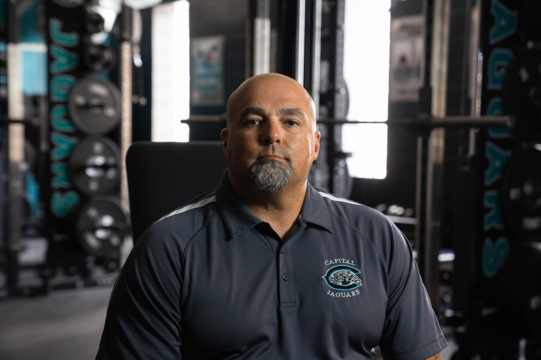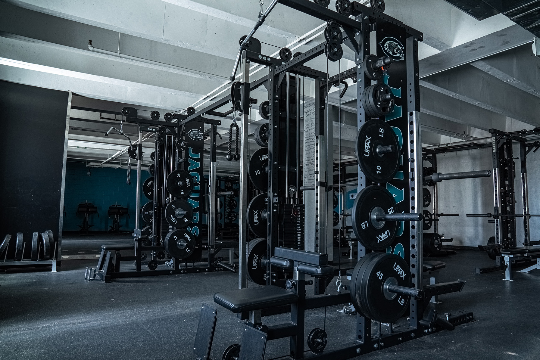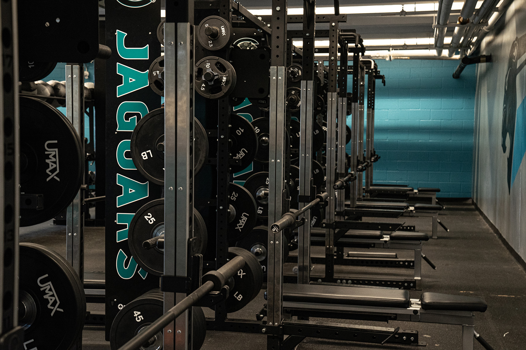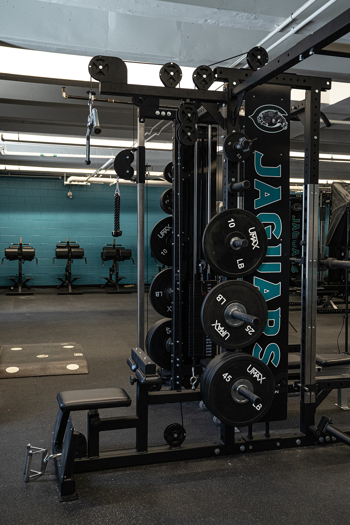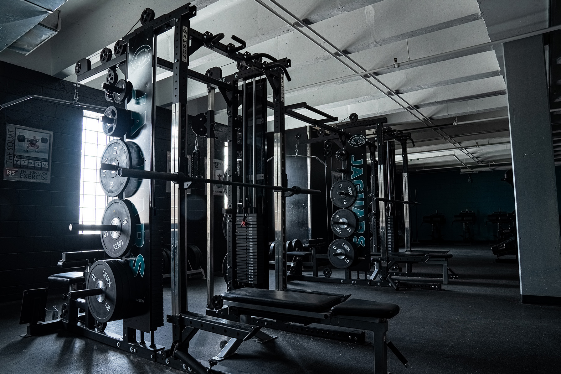 The Capital High School Jaguars refinished weight room features two Samson Flex-Rack Functional Training Rack (FTR) Combo Stations and five Double-sided Flex Rack stations all equipped with Samson Combo Benches. The Jaguars now have a total of 12 lifting stations, two fully adjustable cable columns and two lat-row combo machines. This weight room features a posterior chain area with four Glute-Ham Developers and team branded graphic shields.
