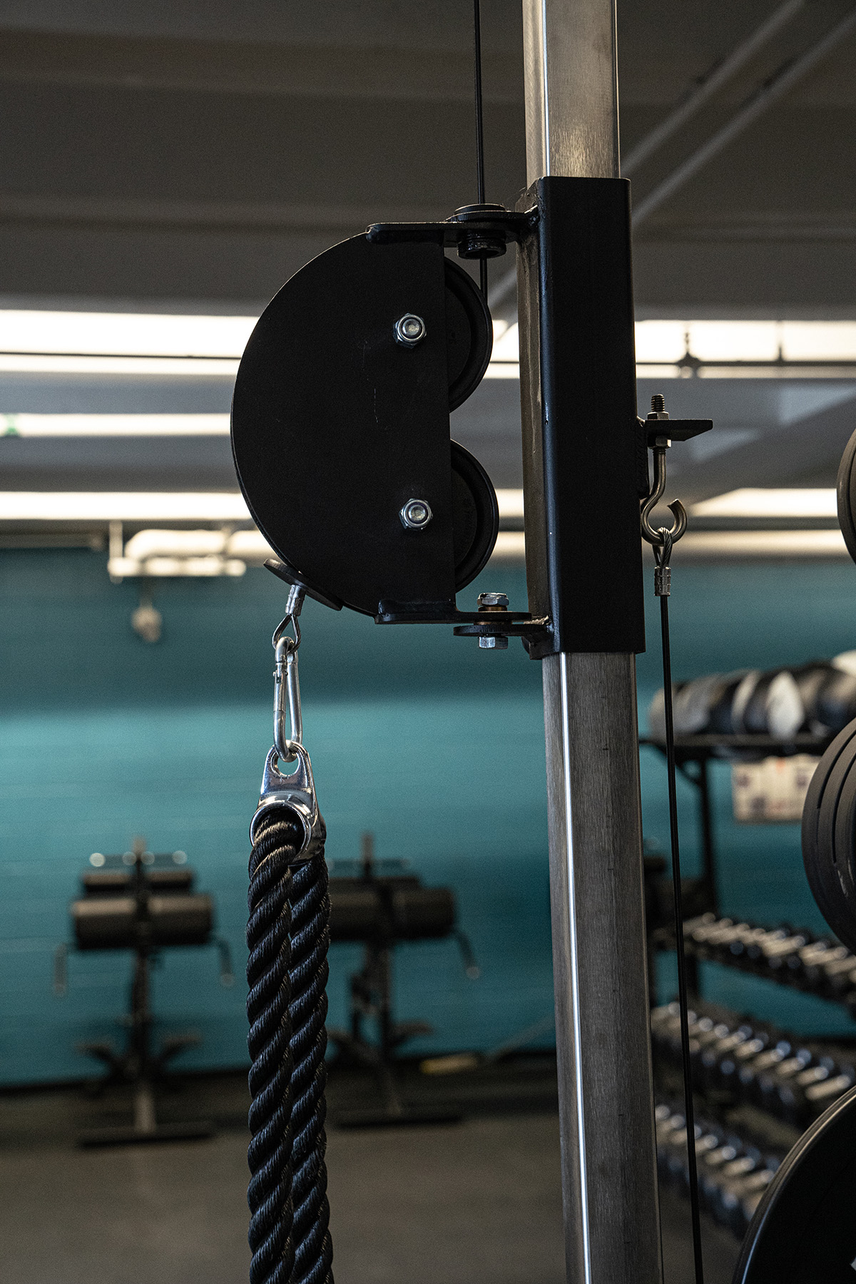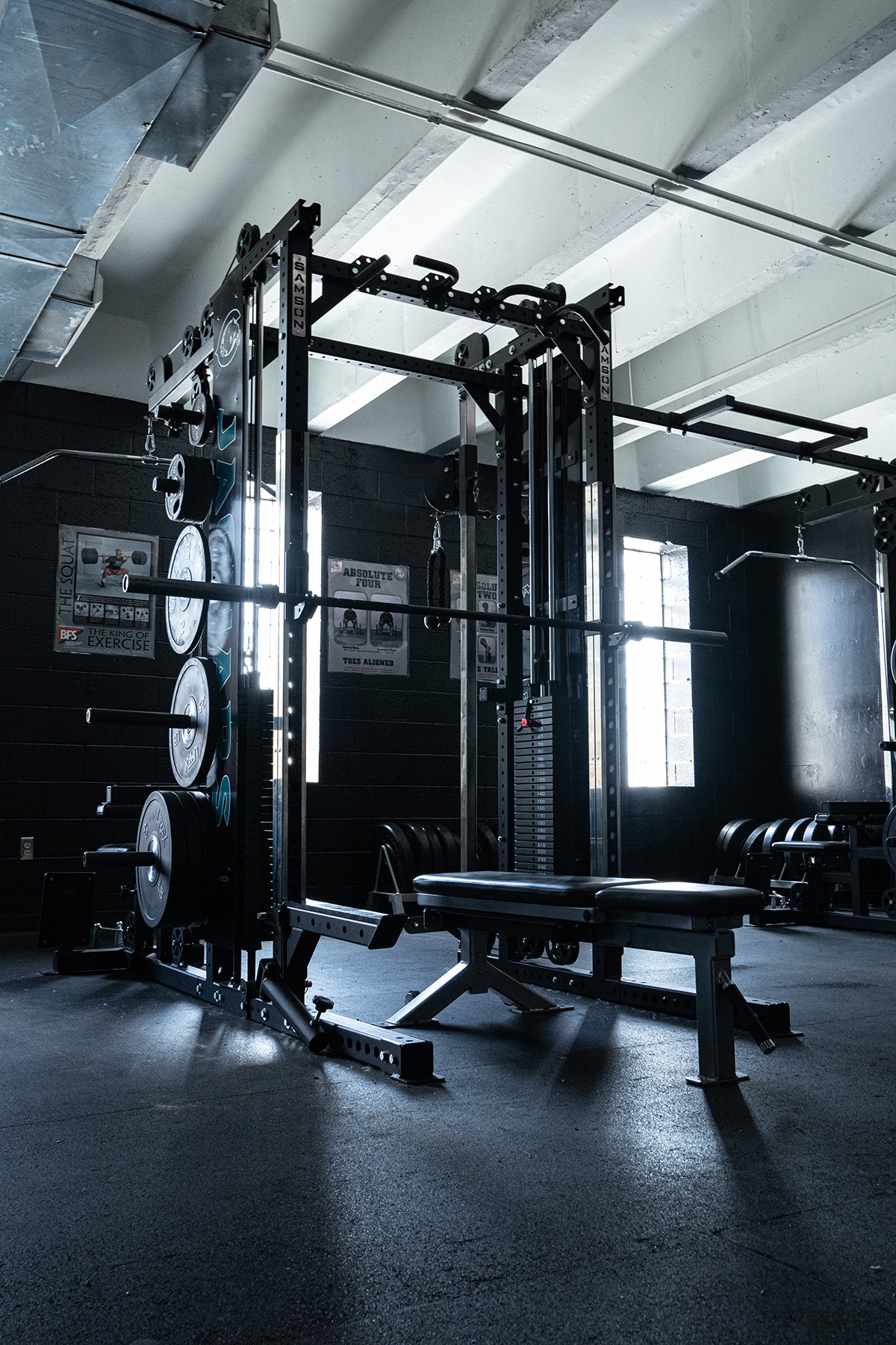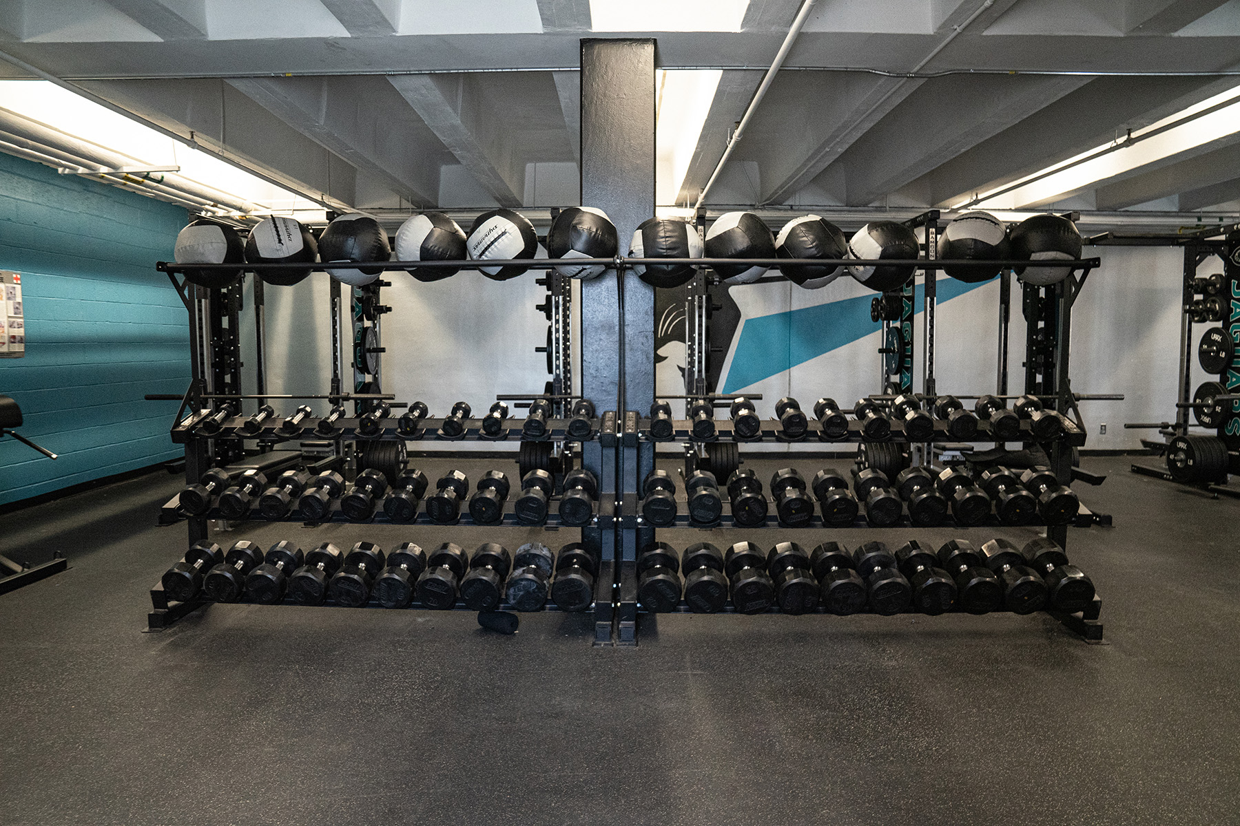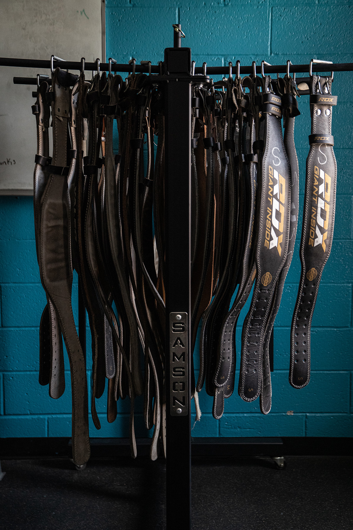 Custom dumbbell and med ball storage, and wheeled lifting belt storage are featured in this room to help save and create space.