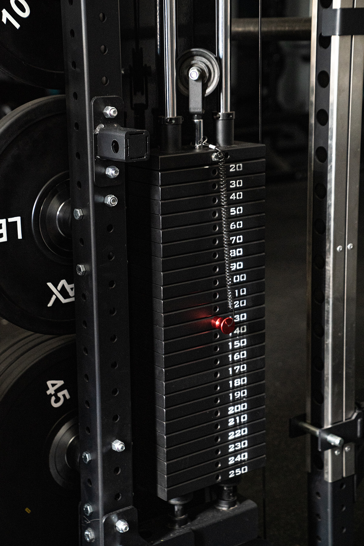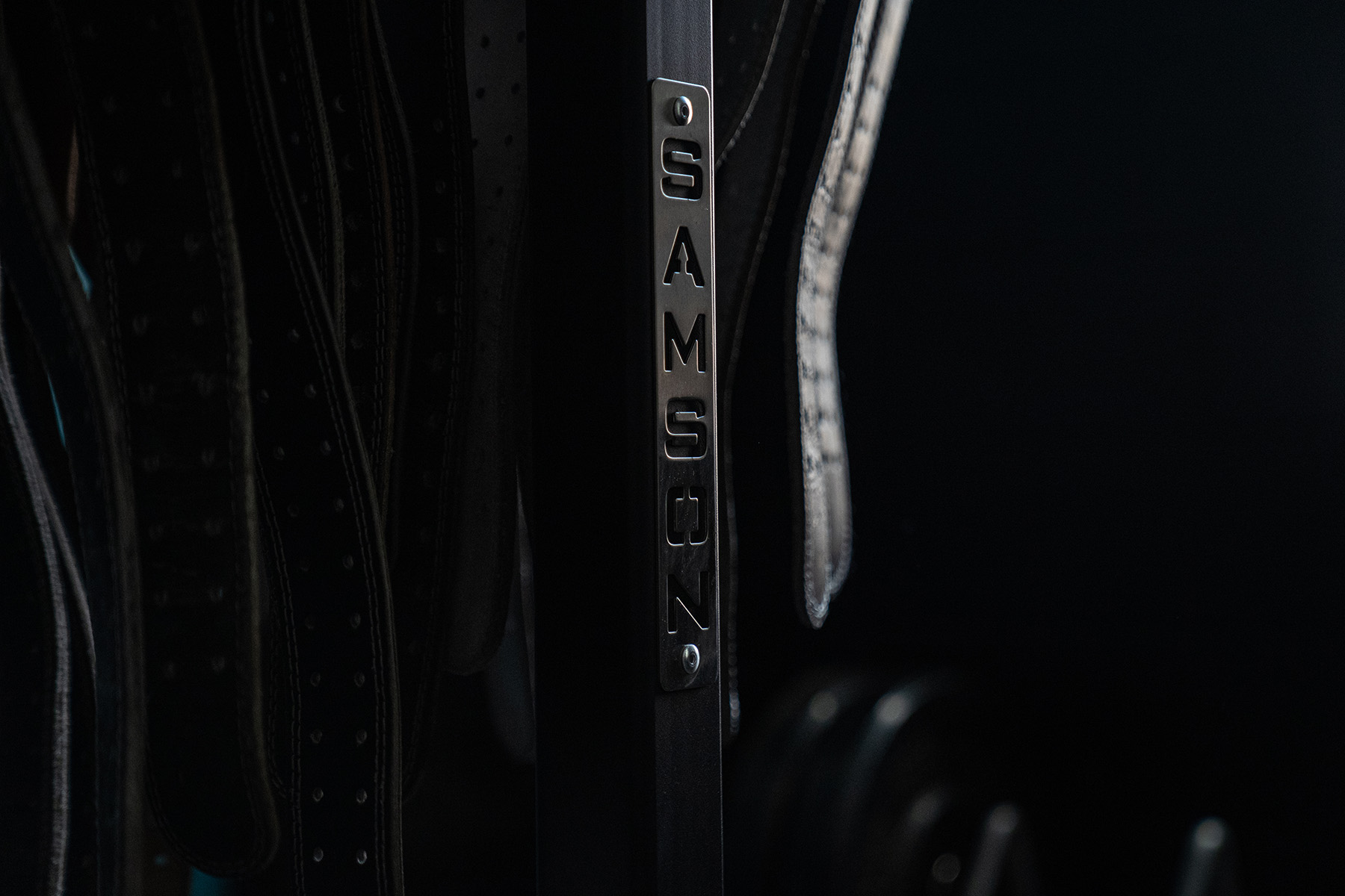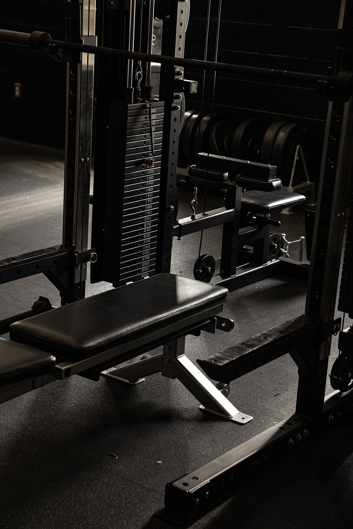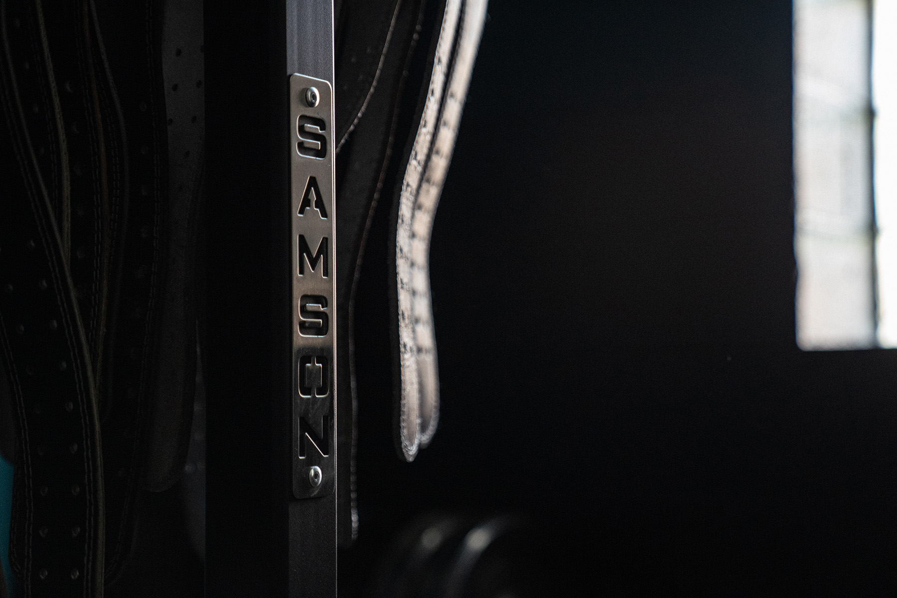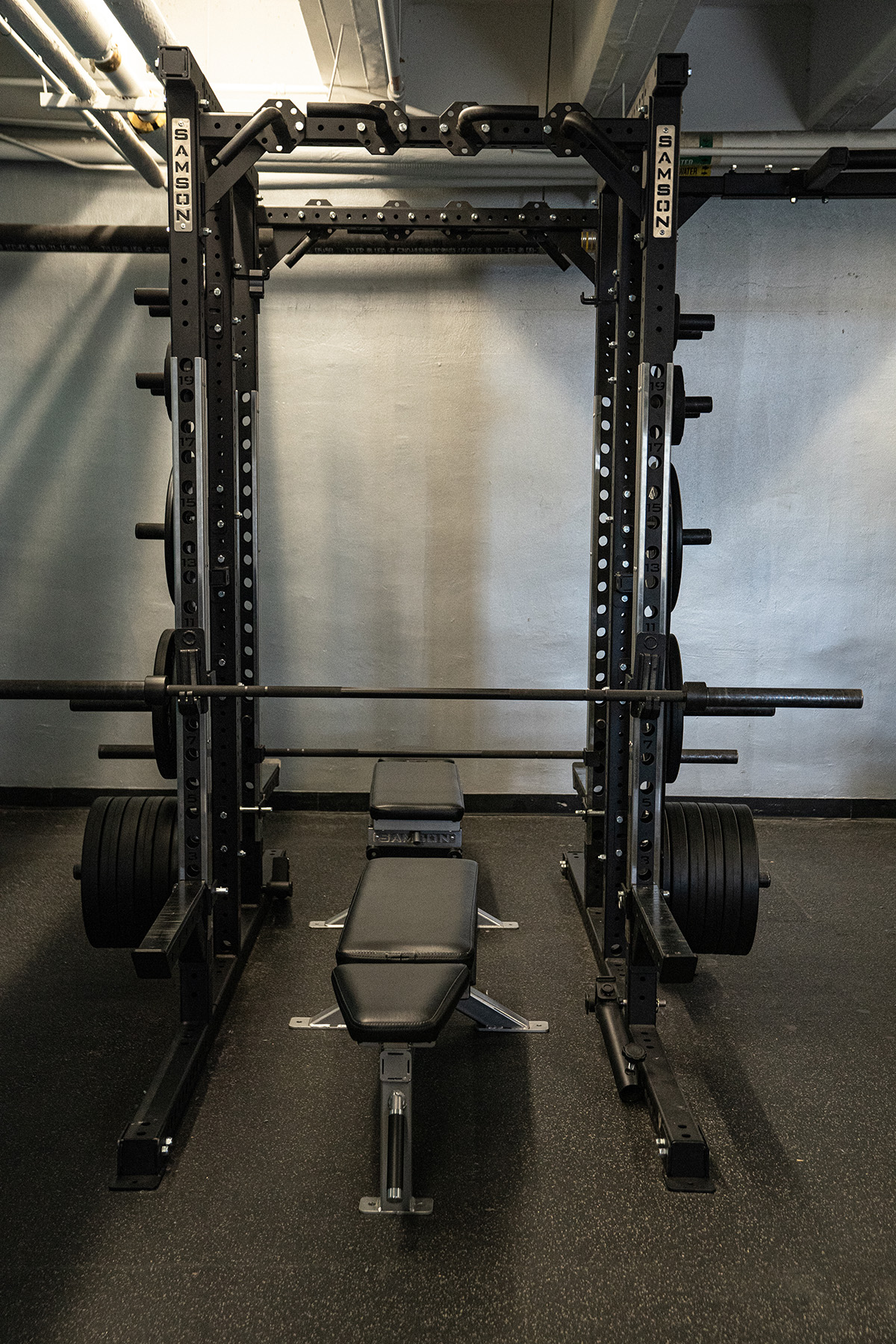 Custom dumbbell and med ball storage, and wheeled lifting belt storage are featured in this room to help save and create space.