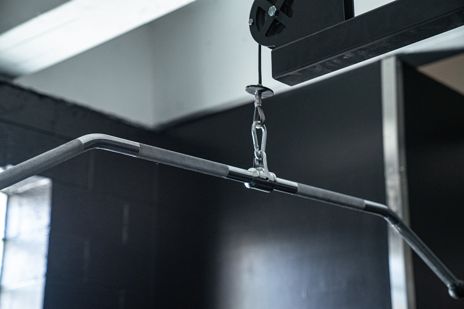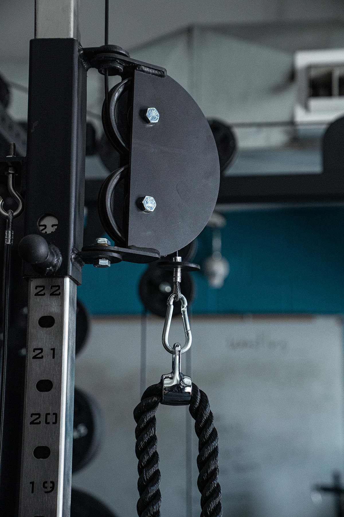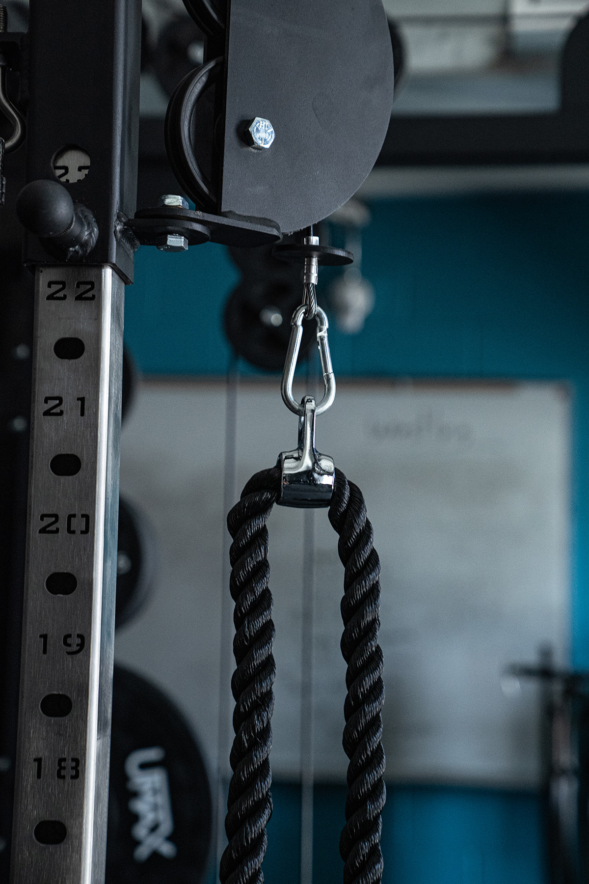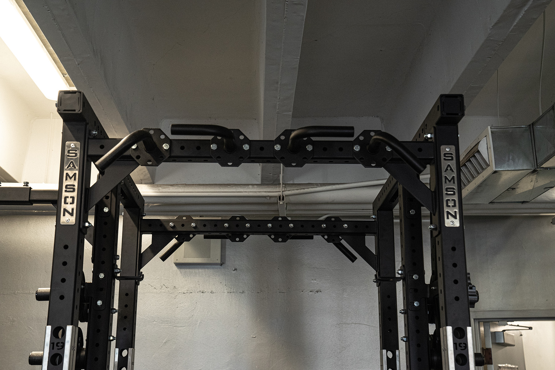 Custom dumbbell and med ball storage, and wheeled lifting belt storage are featured in this room to help save and create space.