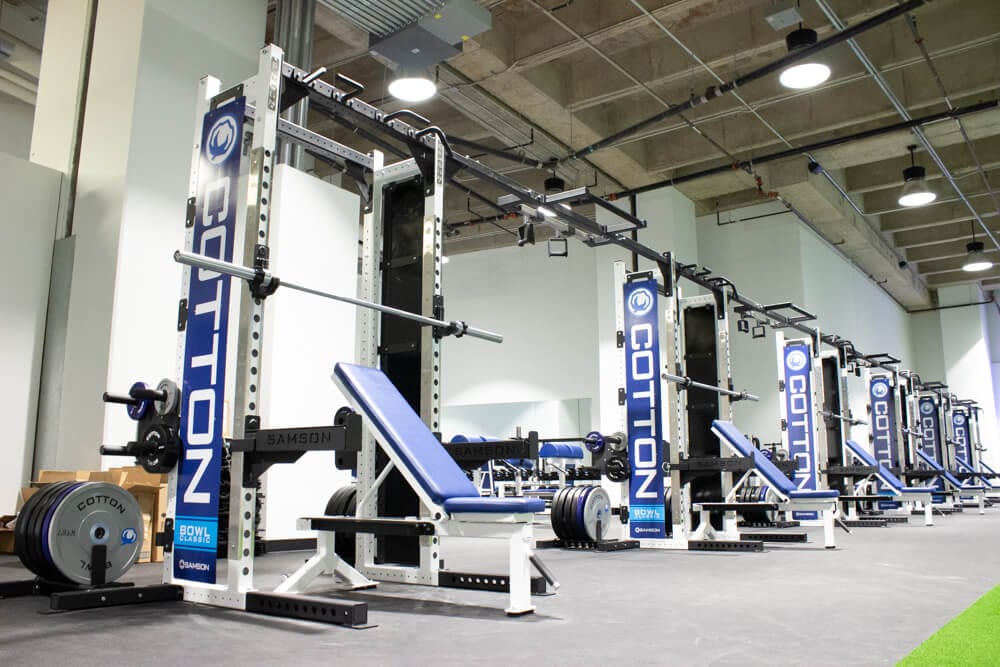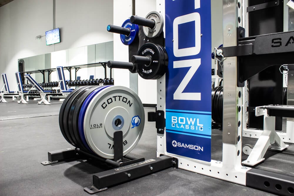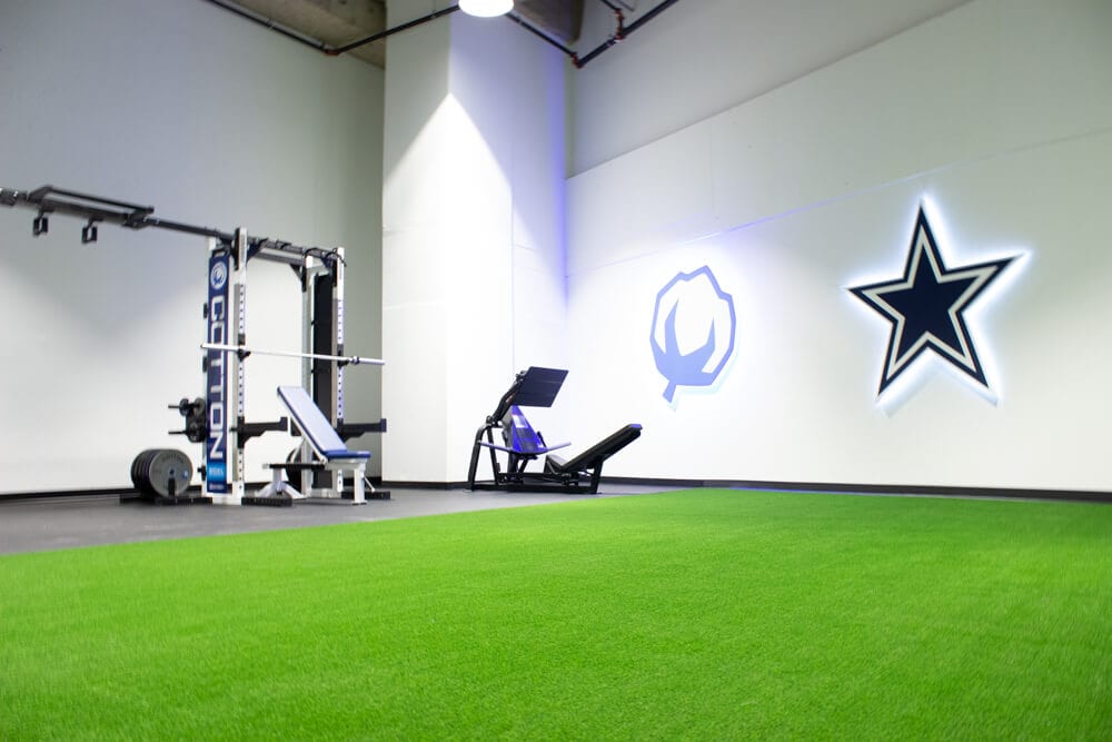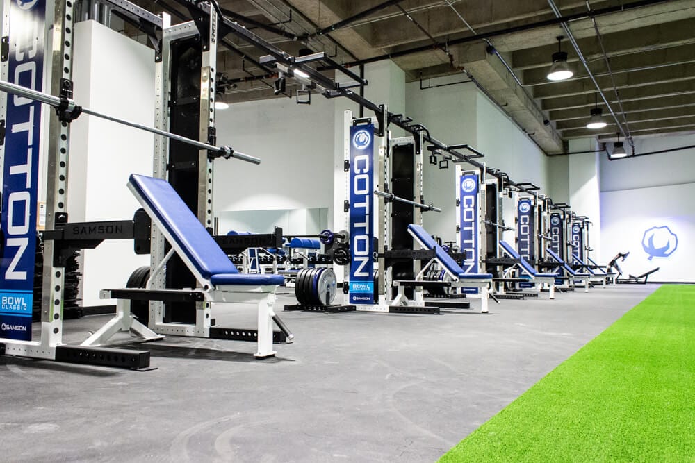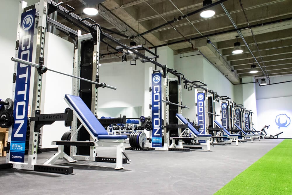 To say this project was unique is an understatement. AT&T Stadium is home to the Cotton Bowl Game, which is a part of the College Football Playoff system each year. Rather than make each team that is selected to play in this game each year to either bring equipment, or train at a local high school, the committee at the Cotton Bowl decided to clear space in AT&T Stadium and build a permanent training facility. In comes custom built Half Racks w/ Graphics, Custom Bumper Plates, horizontal links for each rack, a large DB pit w/ Custom Logo DB’s, Glute Ham Benches, Cardio Area, Custom Pillar Stations a well as a Turf Area for Dynamic Warm Up, Sled Pulls/Push, etc. This is the 1st of it’s kind and puts other other Bowl Games on notice!