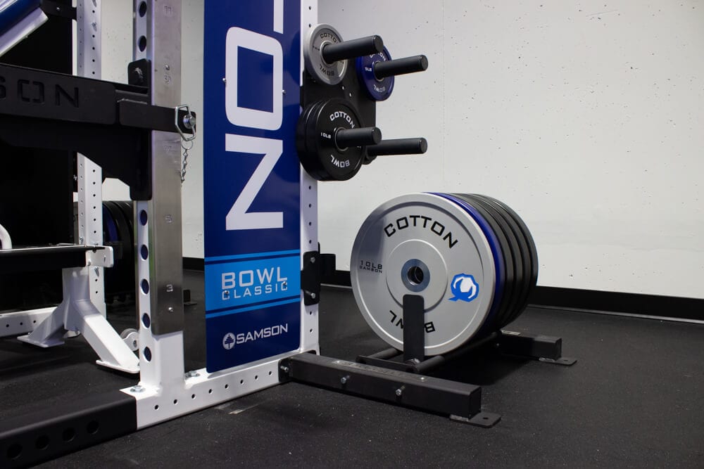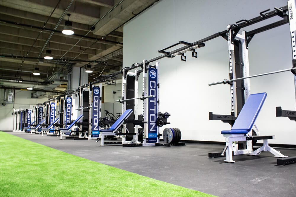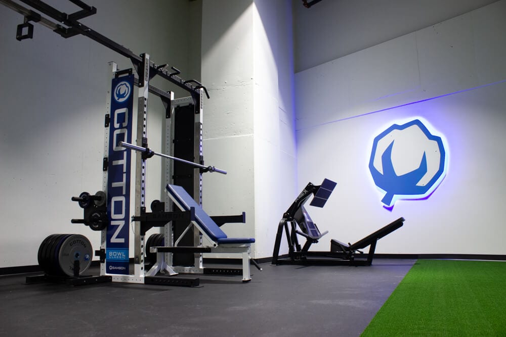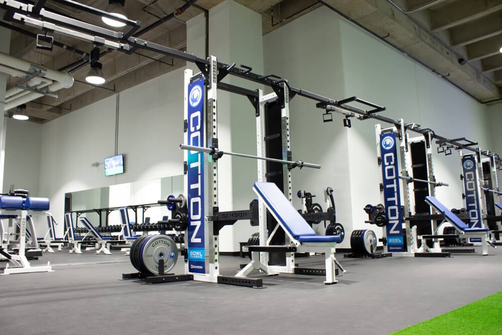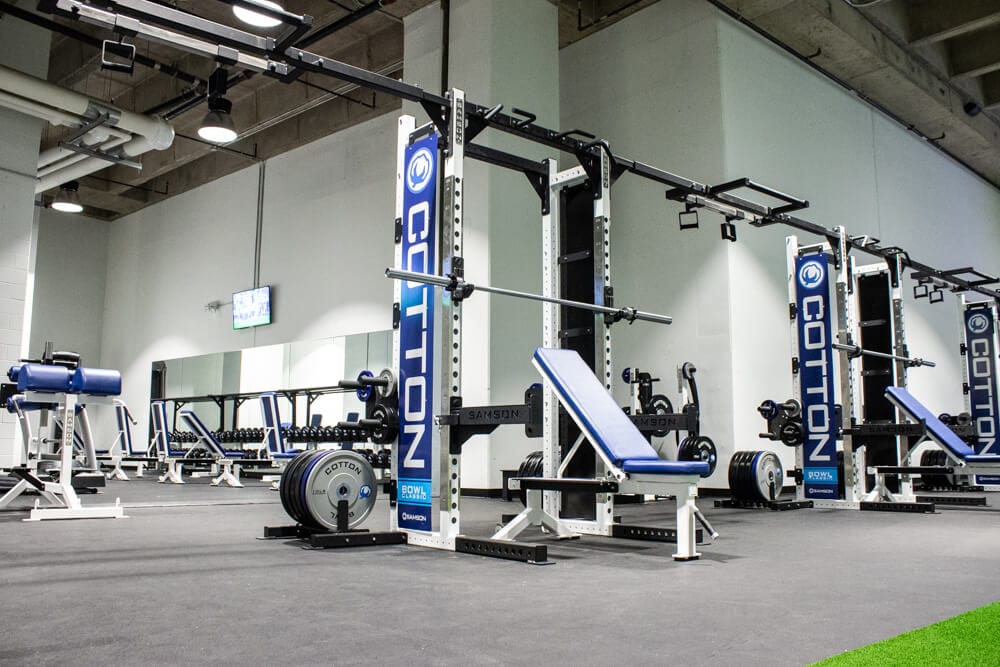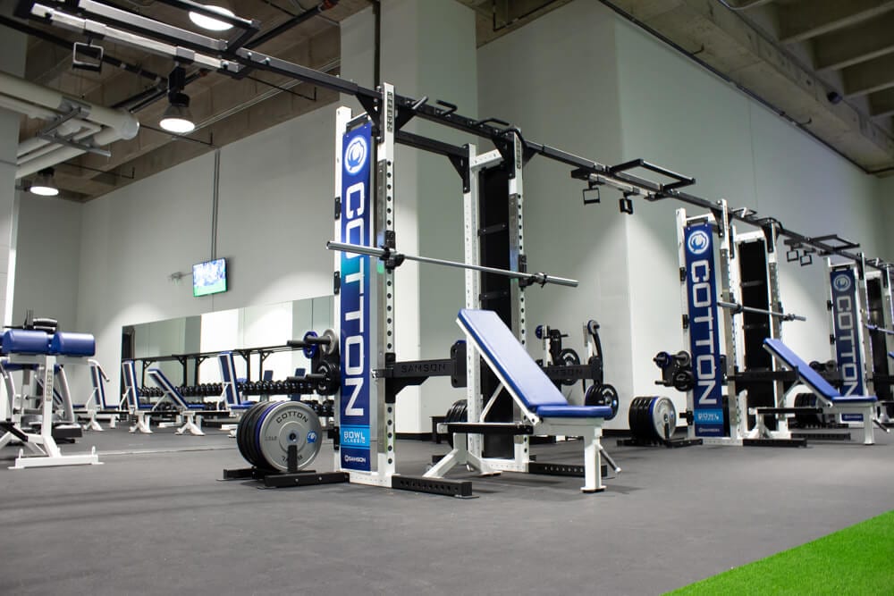 To say this project was unique is an understatement. AT&T Stadium is home to the Cotton Bowl Game, which is a part of the College Football Playoff system each year. Rather than make each team that is selected to play in this game each year to either bring equipment, or train at a local high school, the committee at the Cotton Bowl decided to clear space in AT&T Stadium and build a permanent training facility. In comes custom built Half Racks w/ Graphics, Custom Bumper Plates, horizontal links for each rack, a large DB pit w/ Custom Logo DB’s, Glute Ham Benches, Cardio Area, Custom Pillar Stations a well as a Turf Area for Dynamic Warm Up, Sled Pulls/Push, etc. This is the 1st of it’s kind and puts other other Bowl Games on notice!