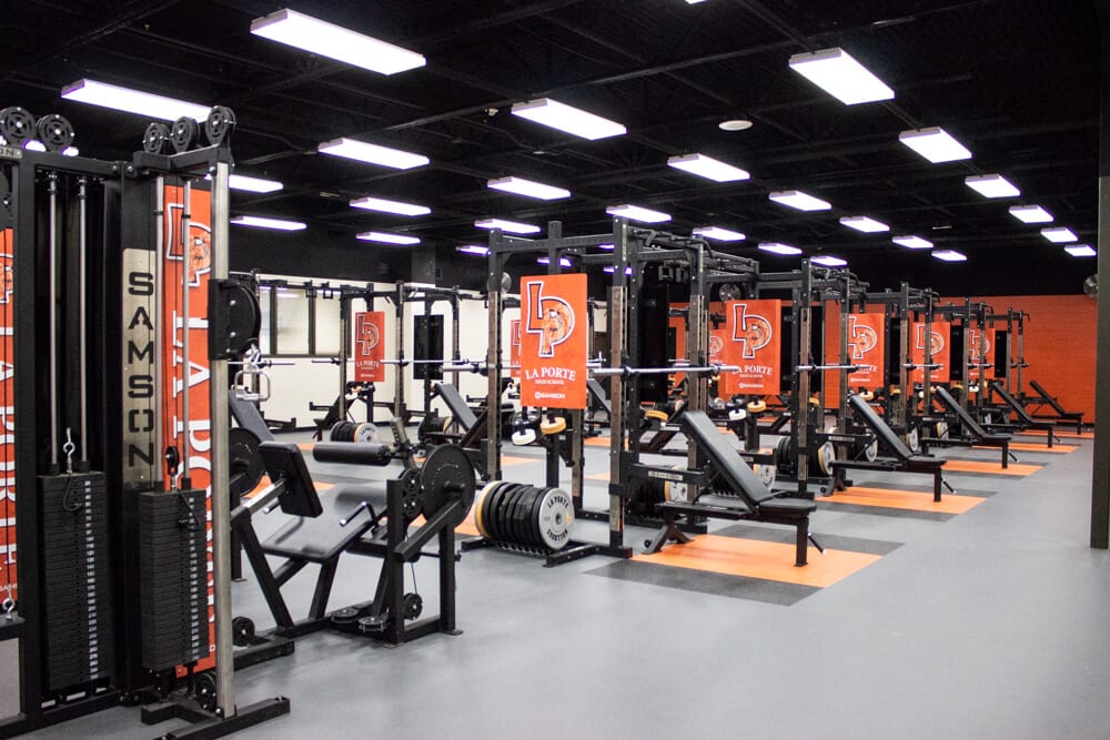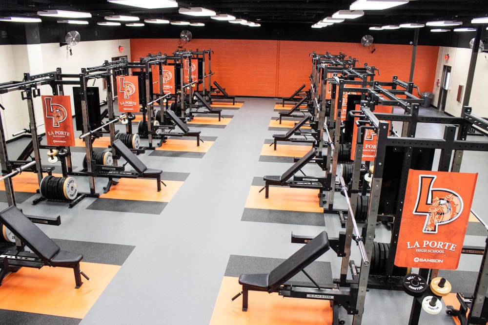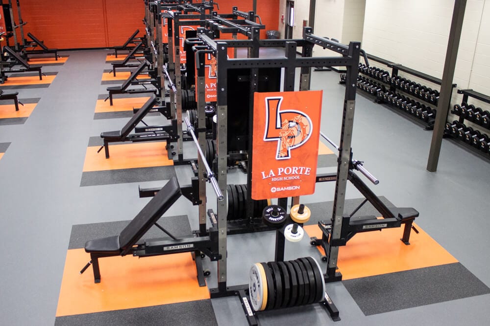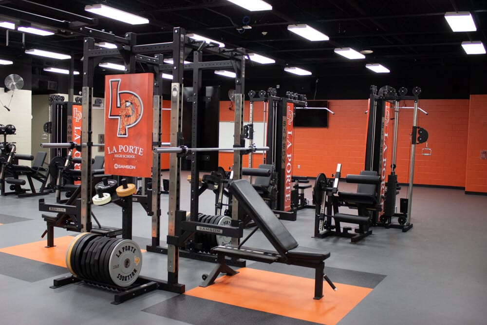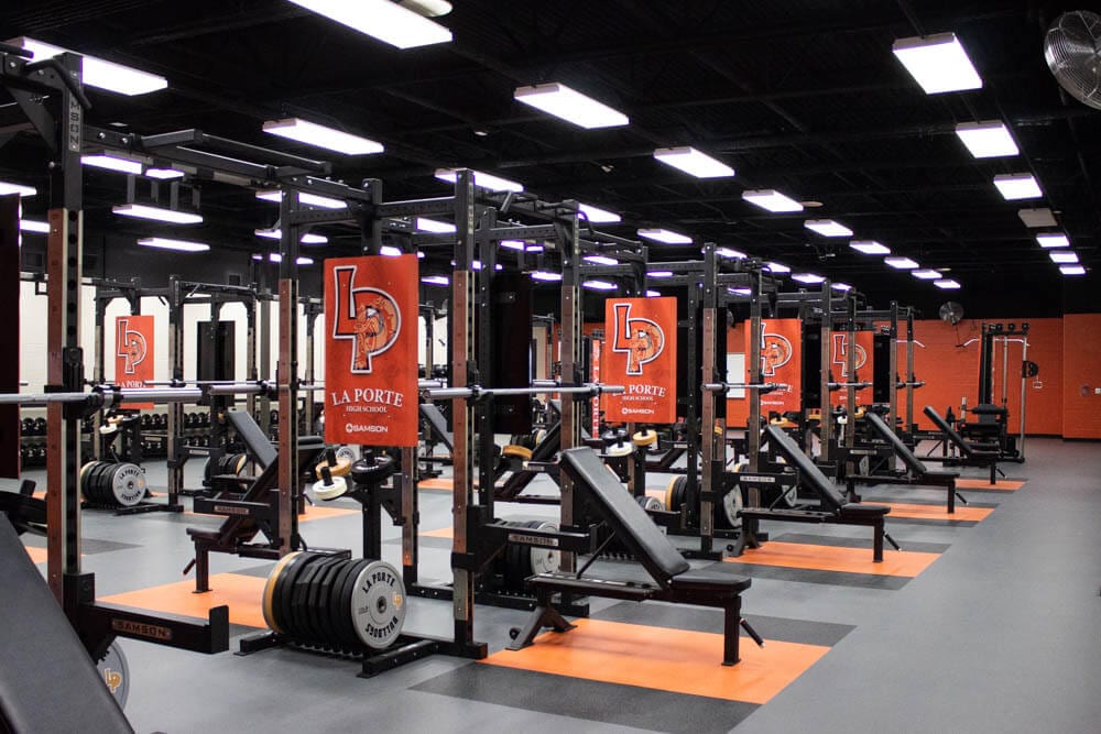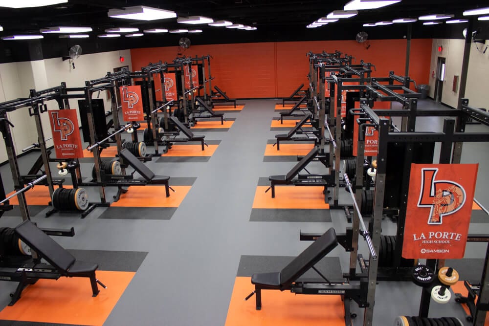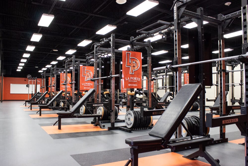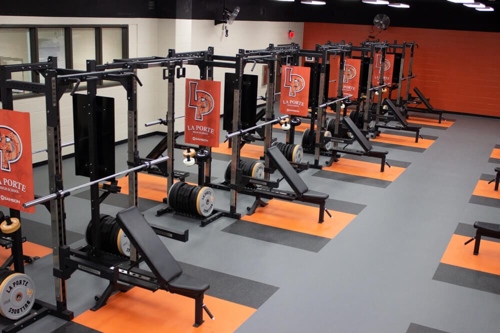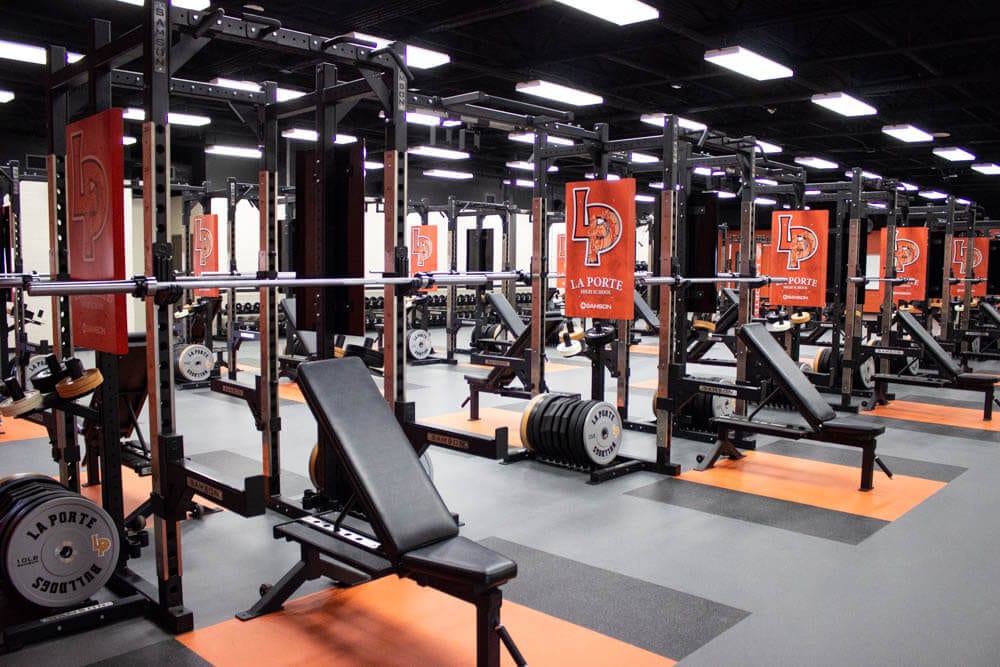 La Porte HS’s new weight training facility is comprised of Custom Double Sided Racks complete with Custom Graphic Panels, Plate Storage, Inlaid Platforms as well as DB Racks, Lat/Row combos w/ Custom Graphics, etc. The Bulldogs are set up for success!! #Samsonstrong