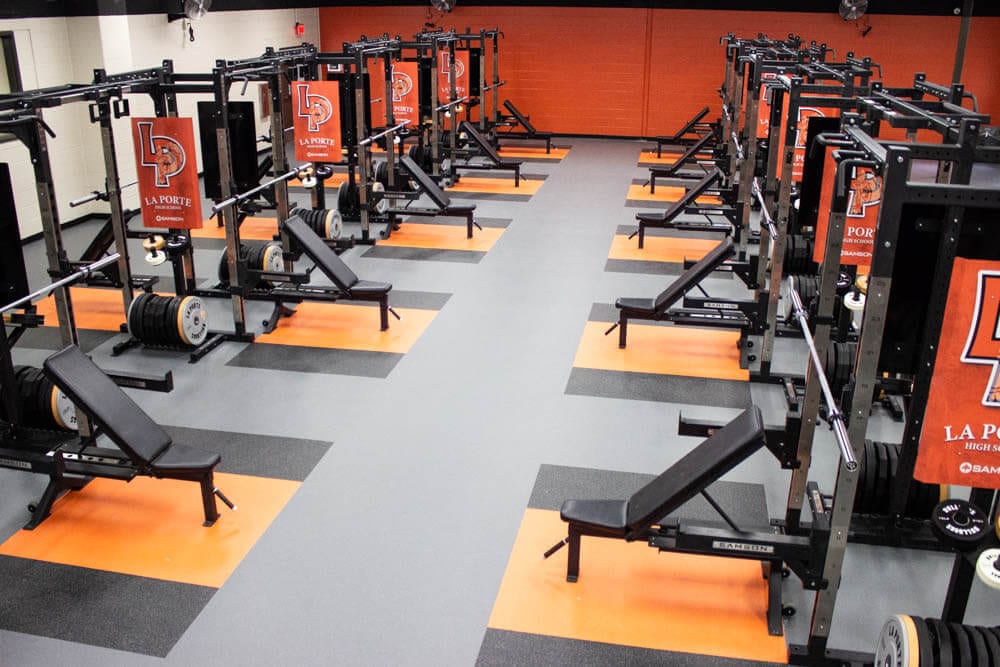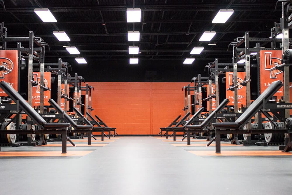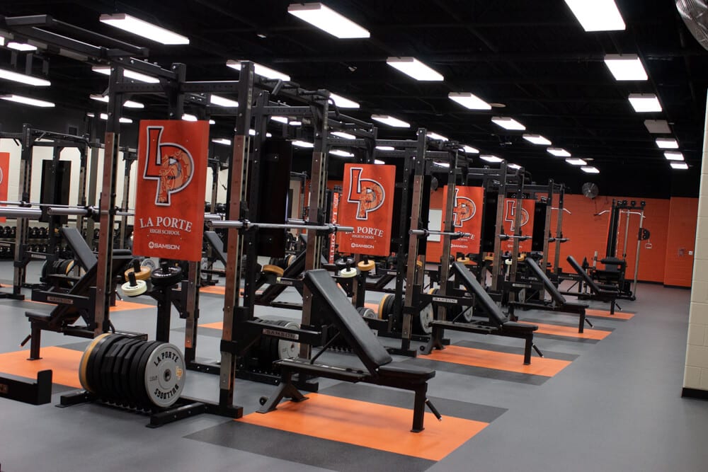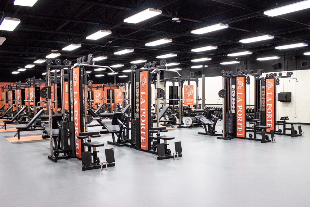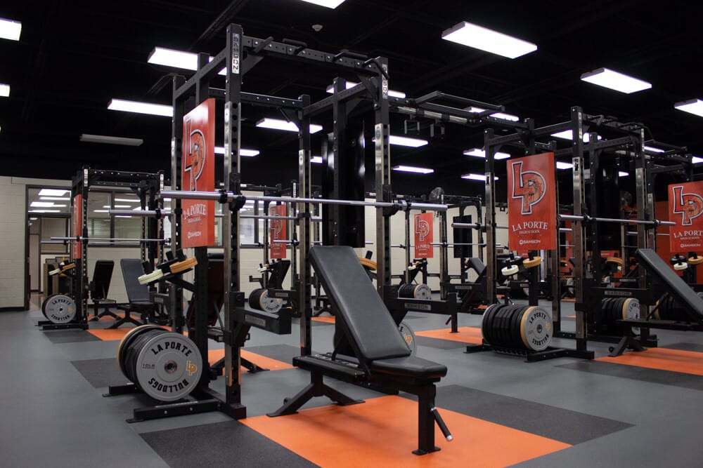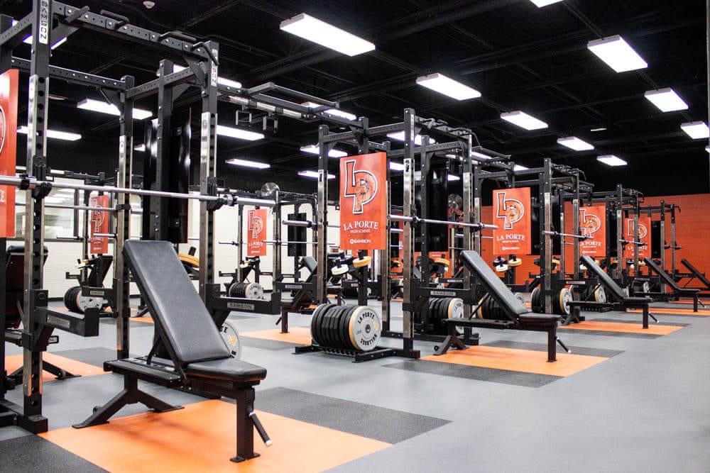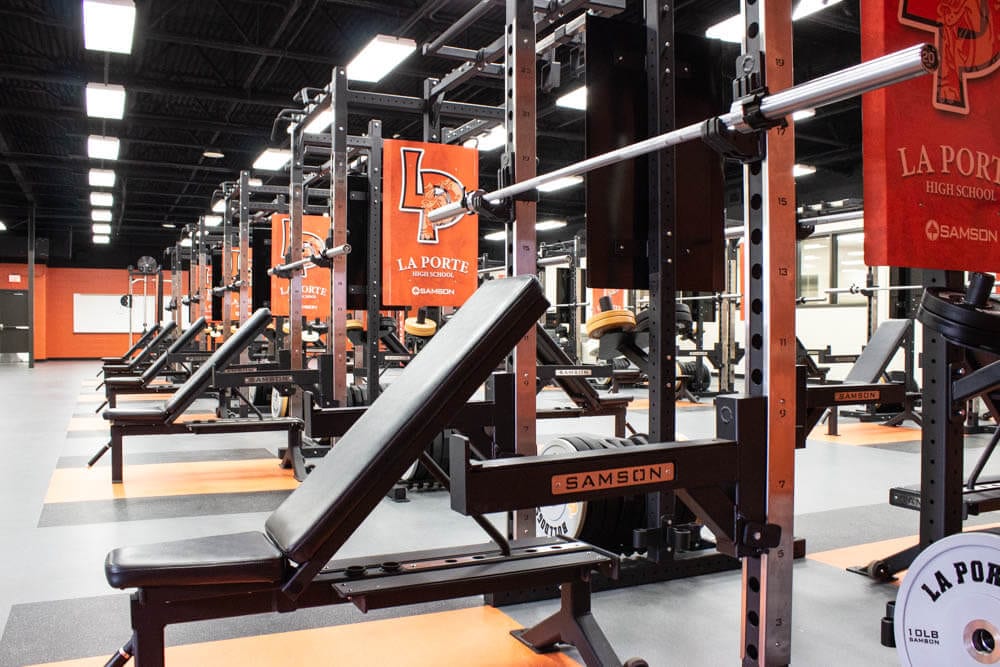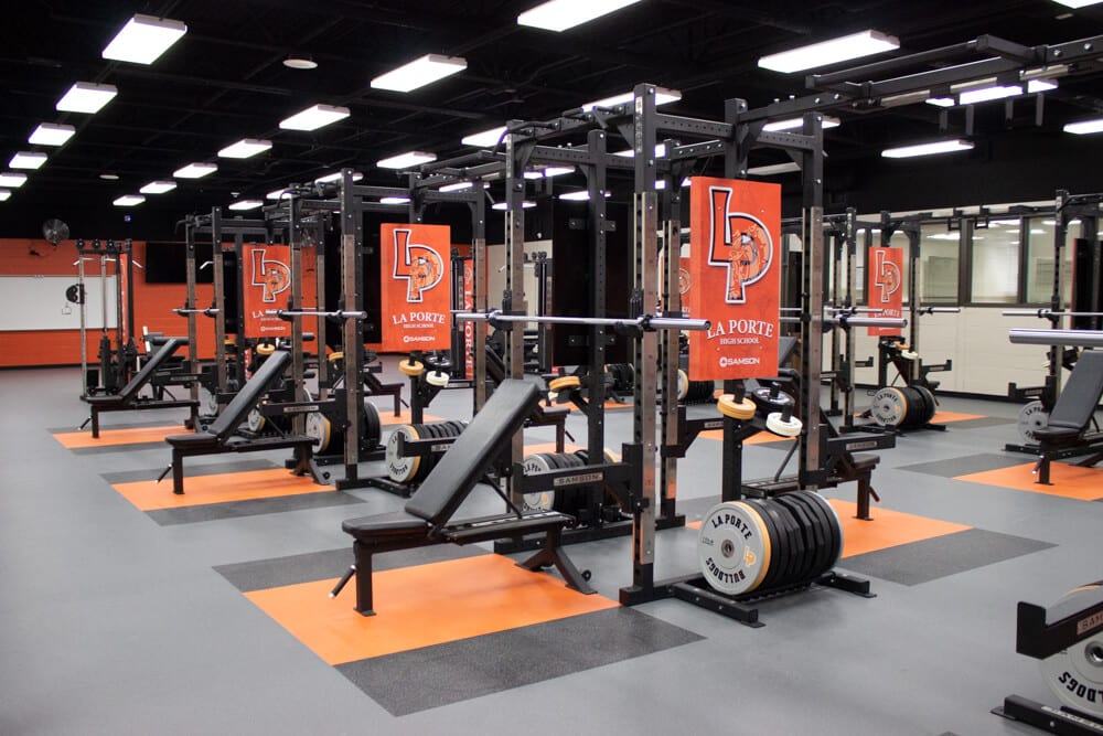 La Porte HS’s new weight training facility is comprised of Custom Double Sided Racks complete with Custom Graphic Panels, Plate Storage, Inlaid Platforms as well as DB Racks, Lat/Row combos w/ Custom Graphics, etc. The Bulldogs are set up for success!! #Samsonstrong