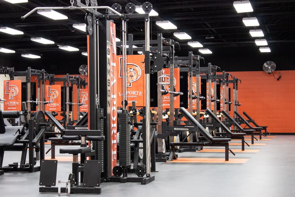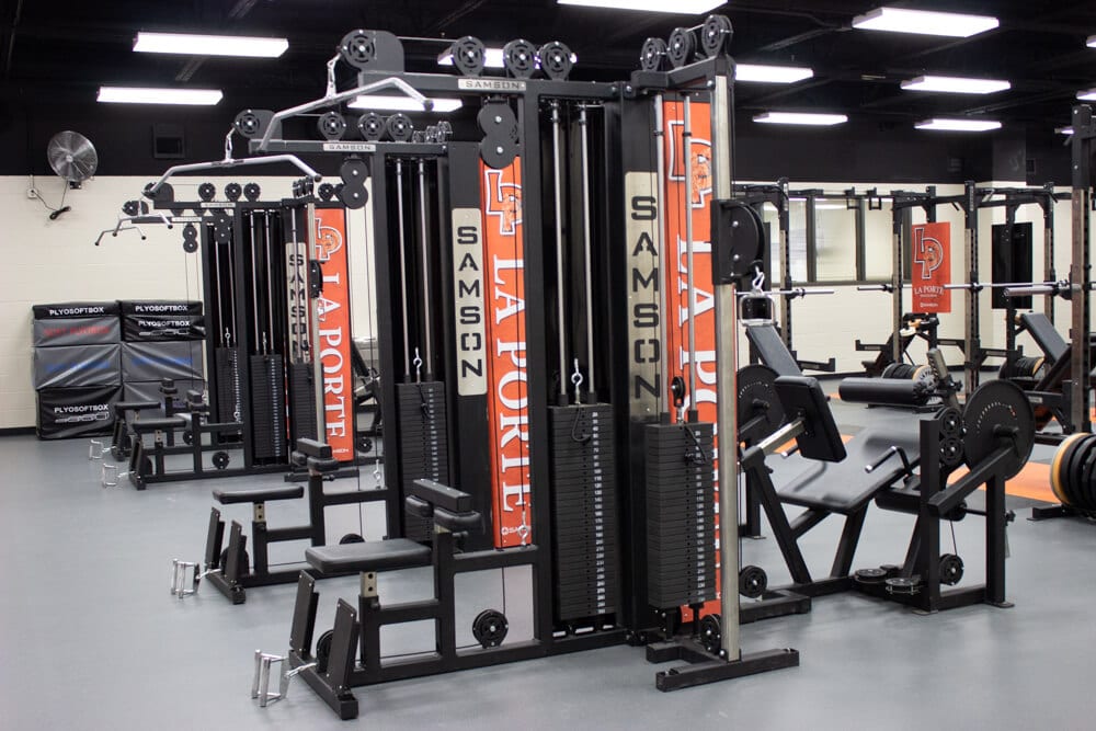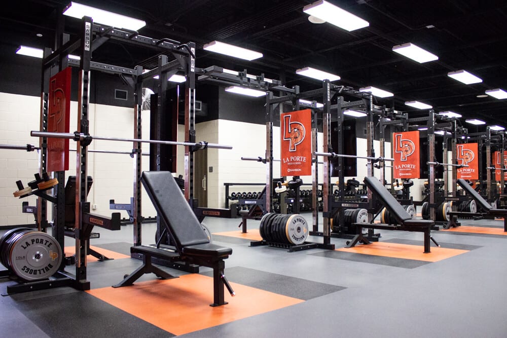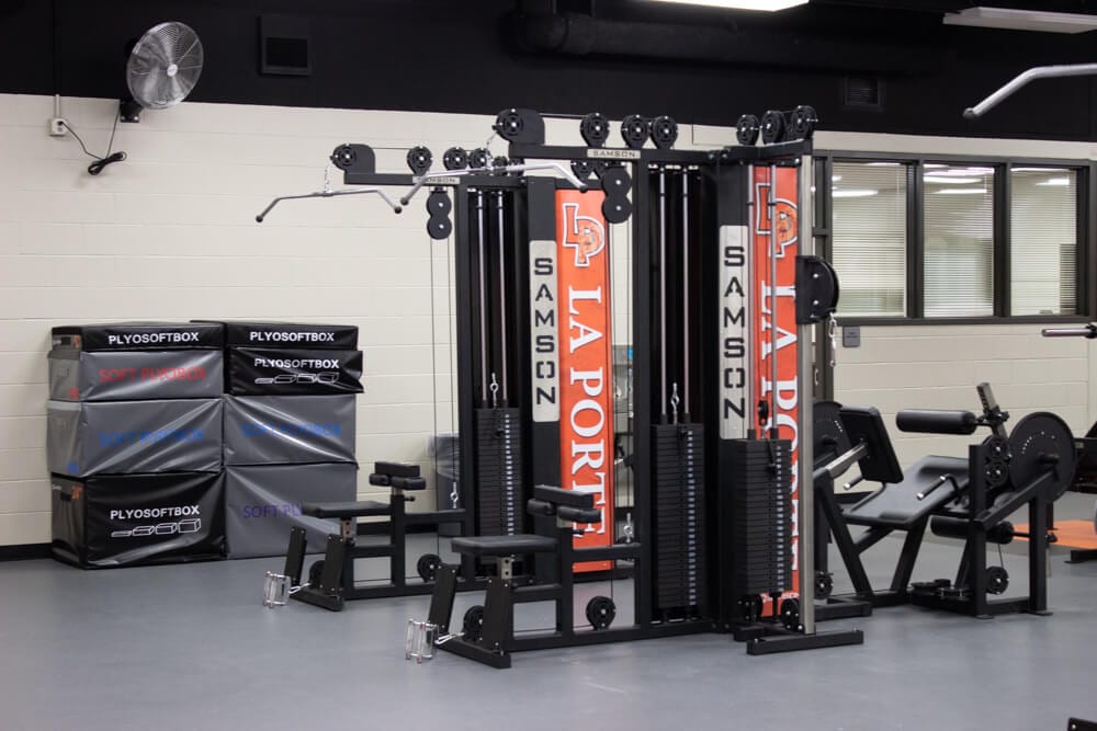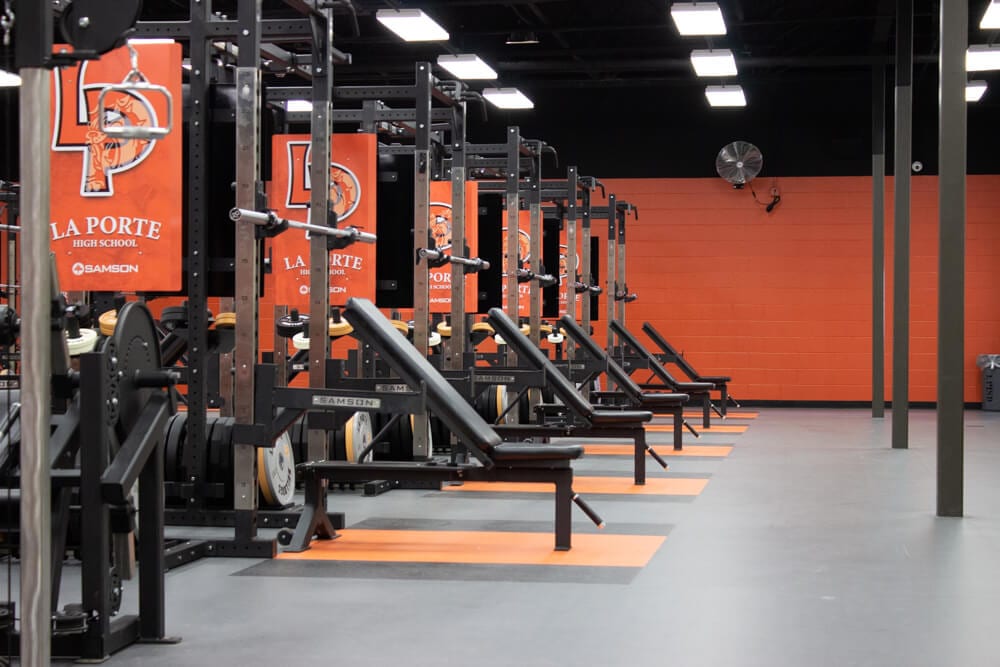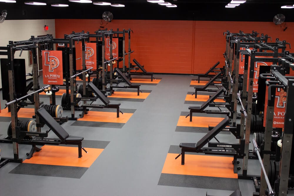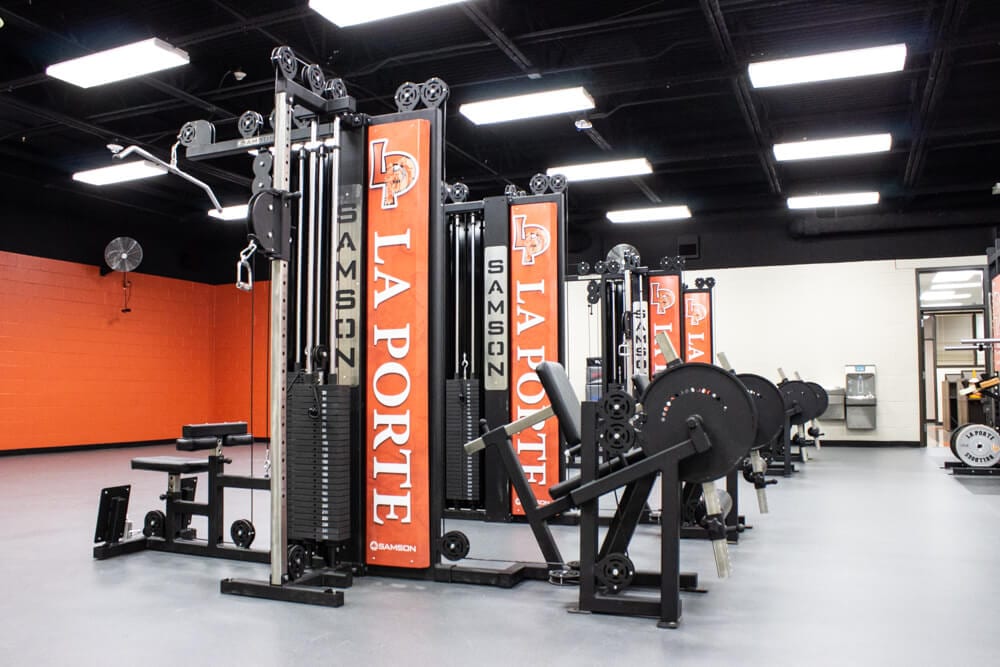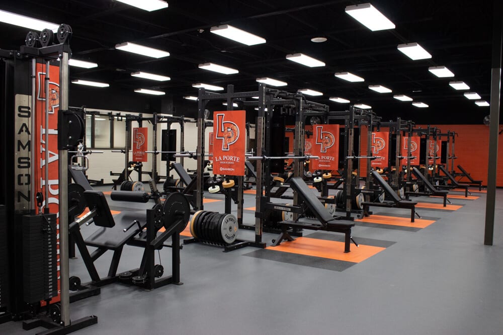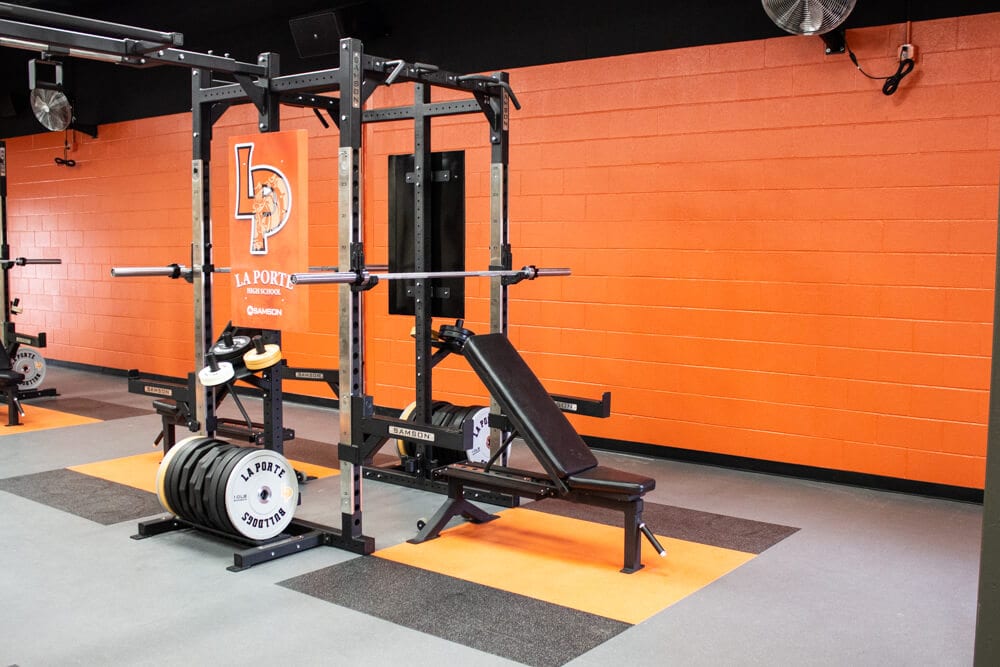 La Porte HS’s new weight training facility is comprised of Custom Double Sided Racks complete with Custom Graphic Panels, Plate Storage, Inlaid Platforms as well as DB Racks, Lat/Row combos w/ Custom Graphics, etc. The Bulldogs are set up for success!! #Samsonstrong