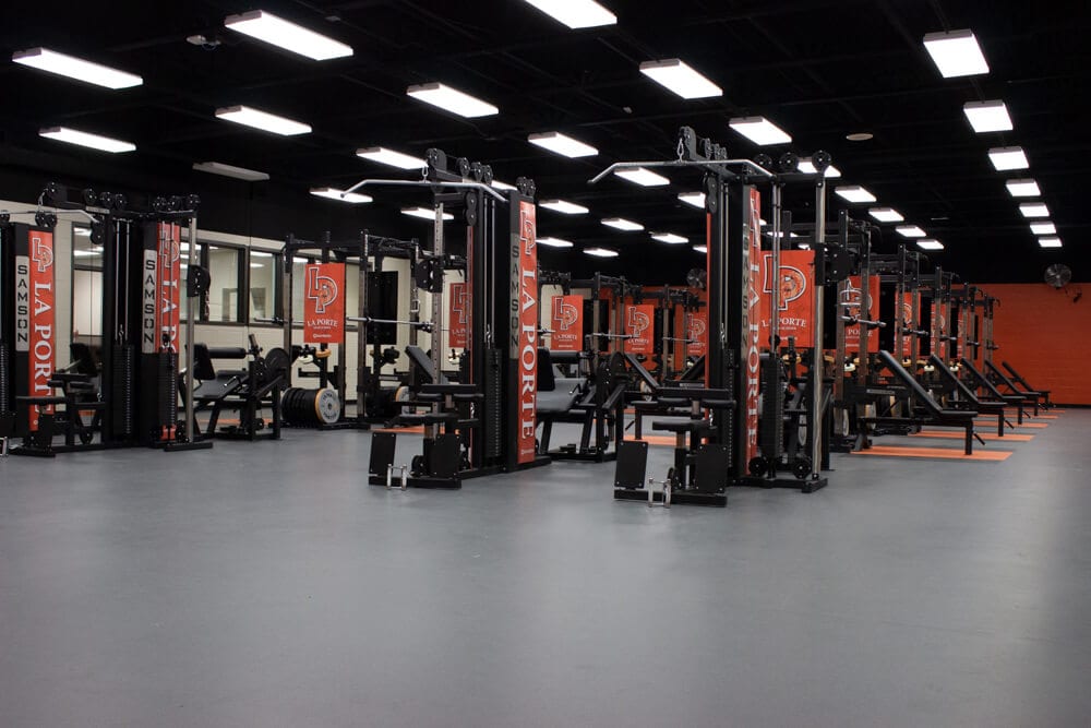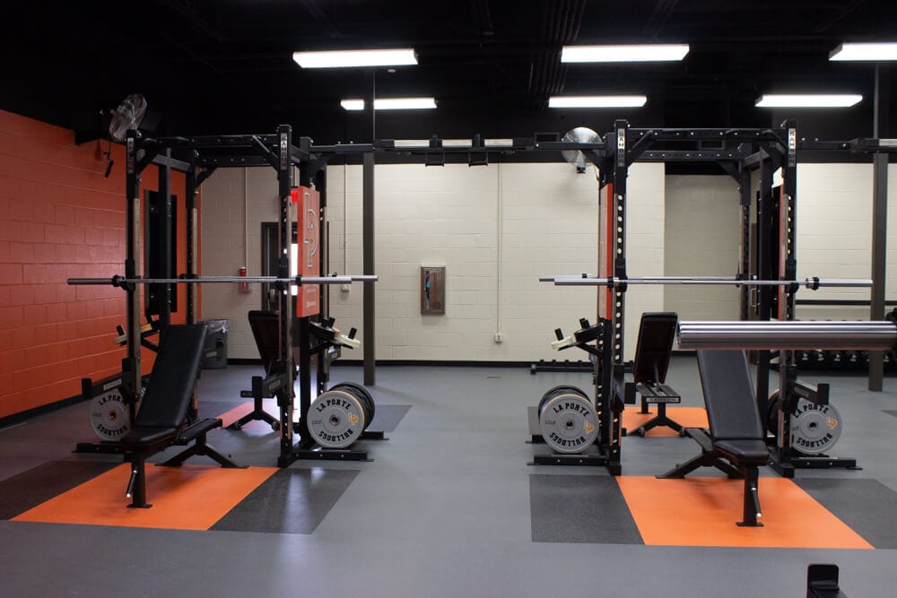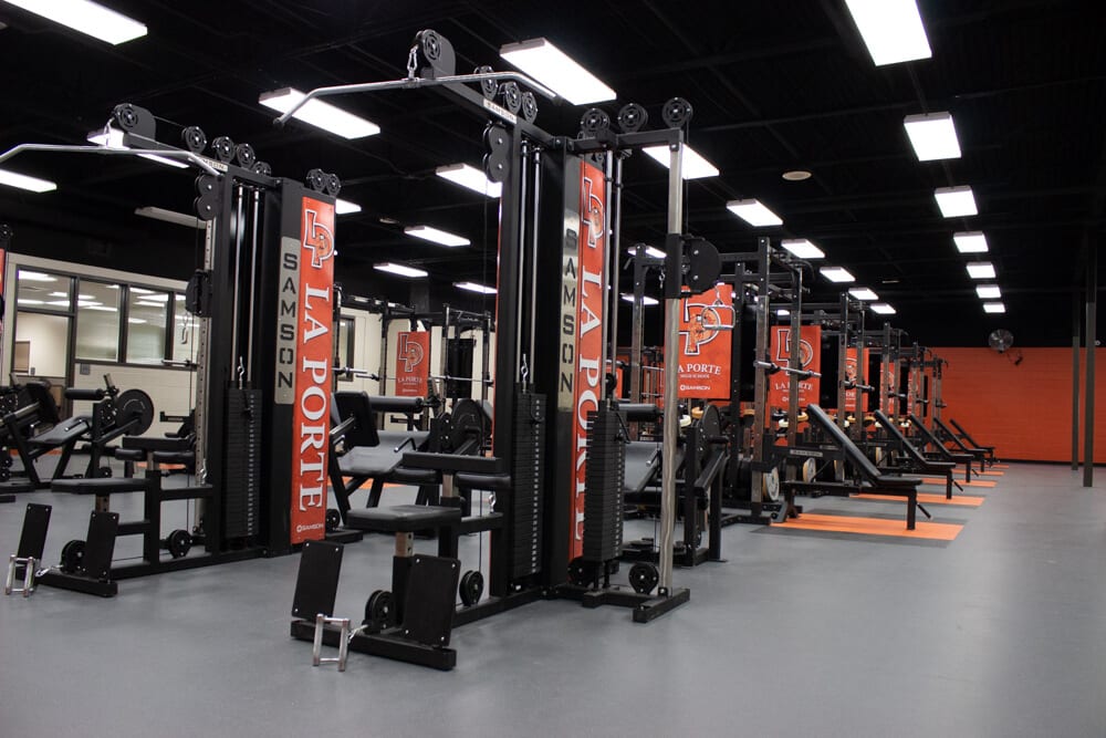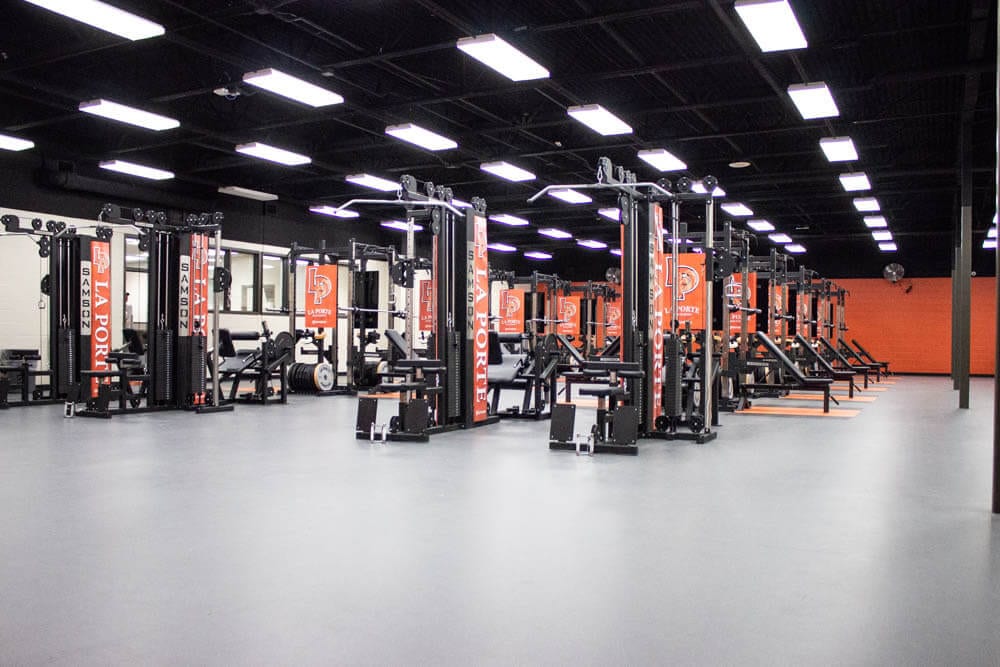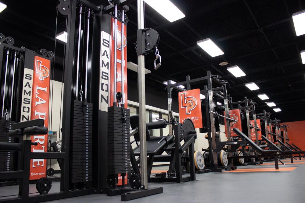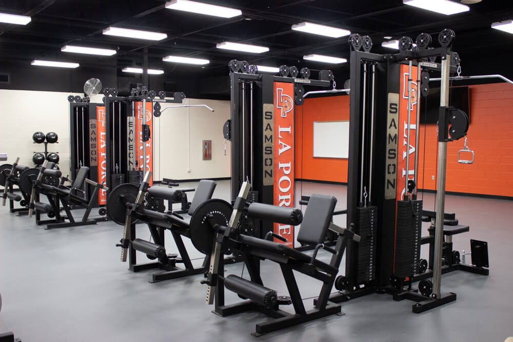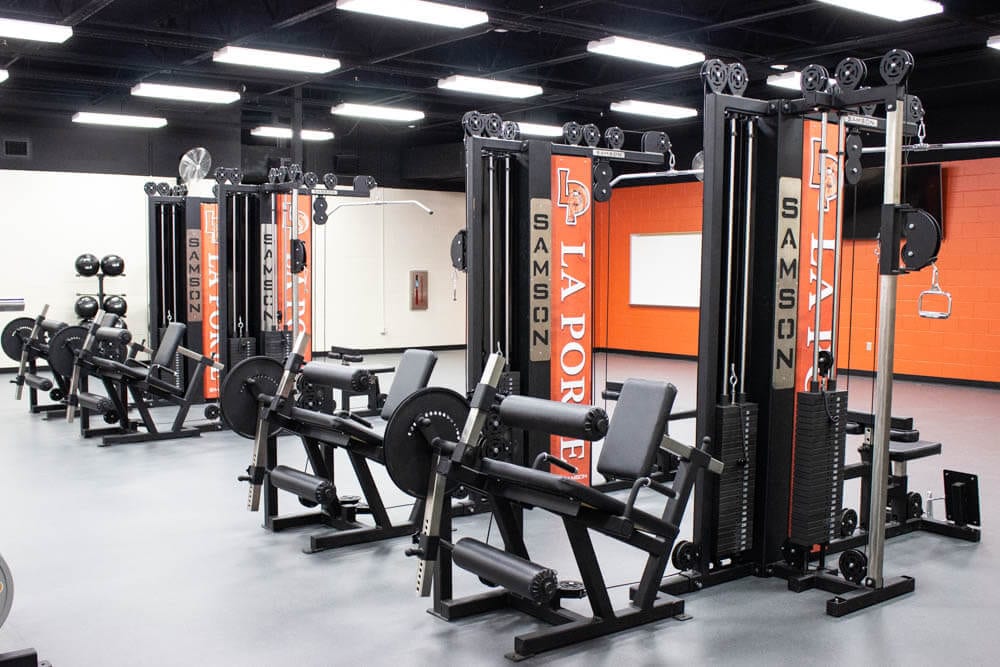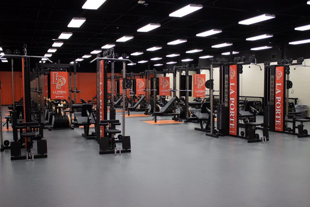 La Porte HS’s new weight training facility is comprised of Custom Double Sided Racks complete with Custom Graphic Panels, Plate Storage, Inlaid Platforms as well as DB Racks, Lat/Row combos w/ Custom Graphics, etc. The Bulldogs are set up for success!! #Samsonstrong