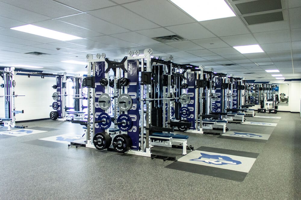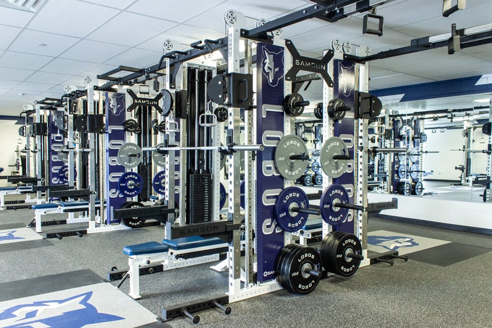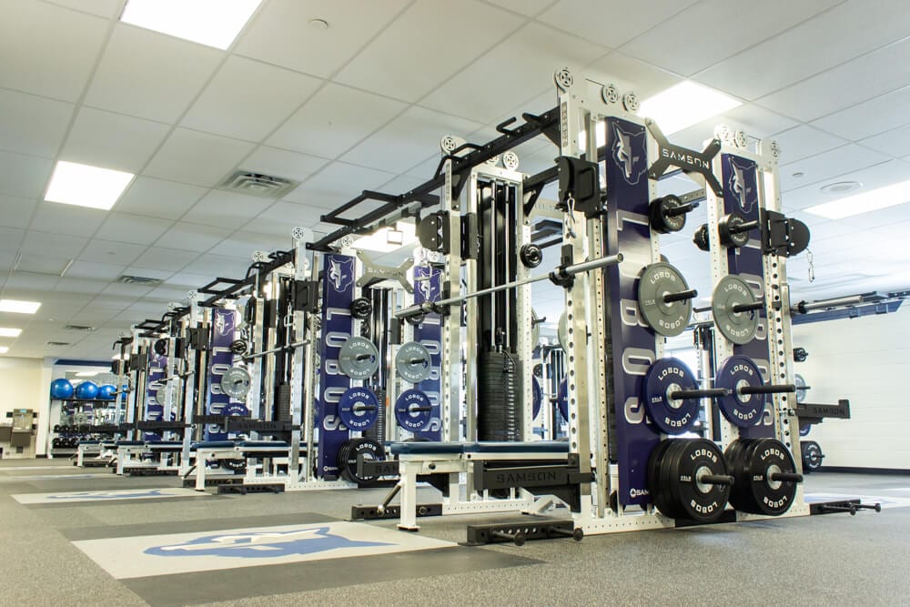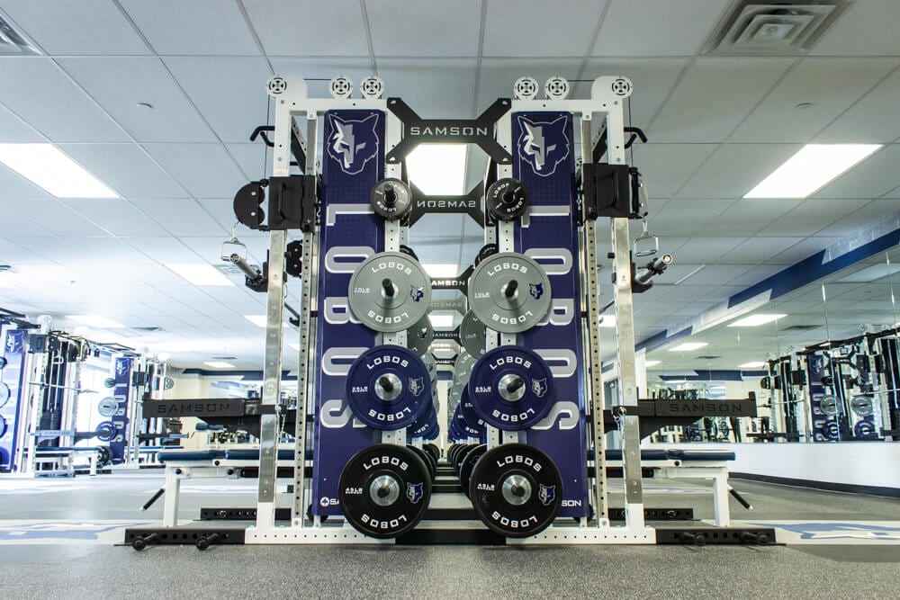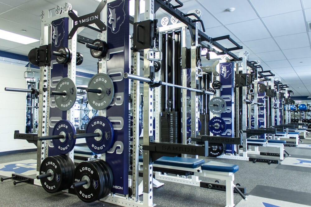 Located just outside of El Paso TX stands one of the finest weight training facilities you’ll find! All new Custom Logo Inlaid Platforms, FTR Racks Linked together w/ Custom Graphics, Custom Color/Logo Bumper Plates, Large DB area w/ Custom Logo DB’s, Belt Squats, Various Lower Body Machines, etc. No doubt the Lobos are set up for success for years to come!