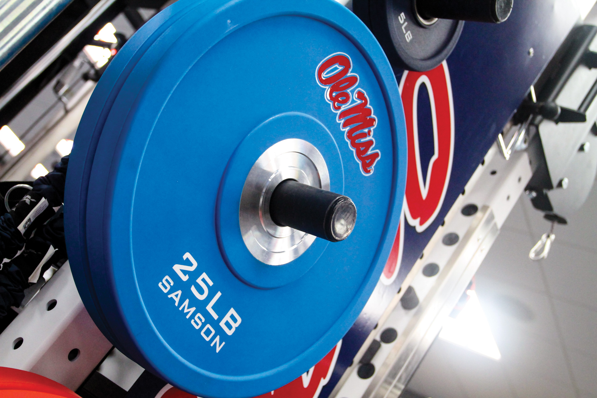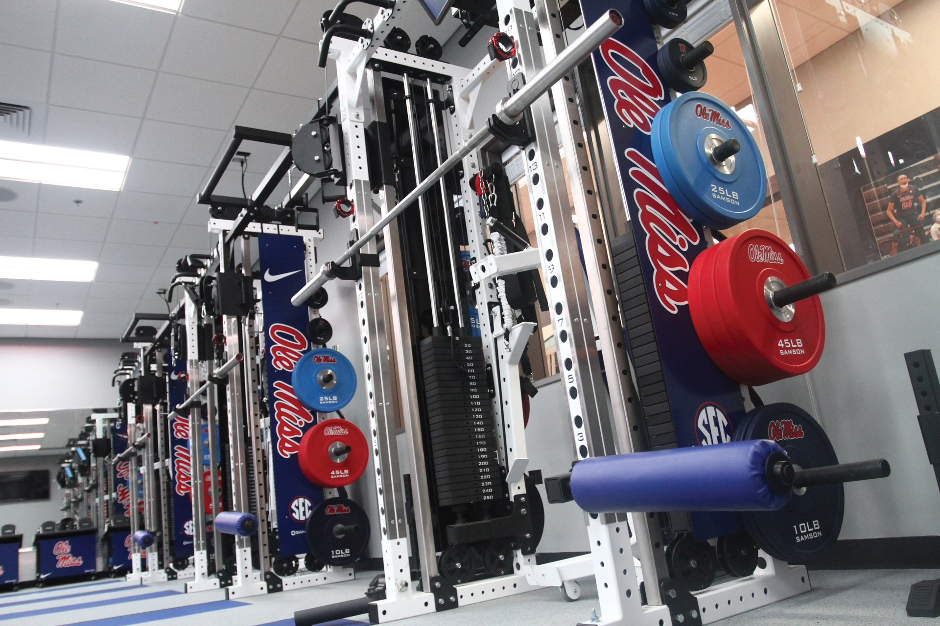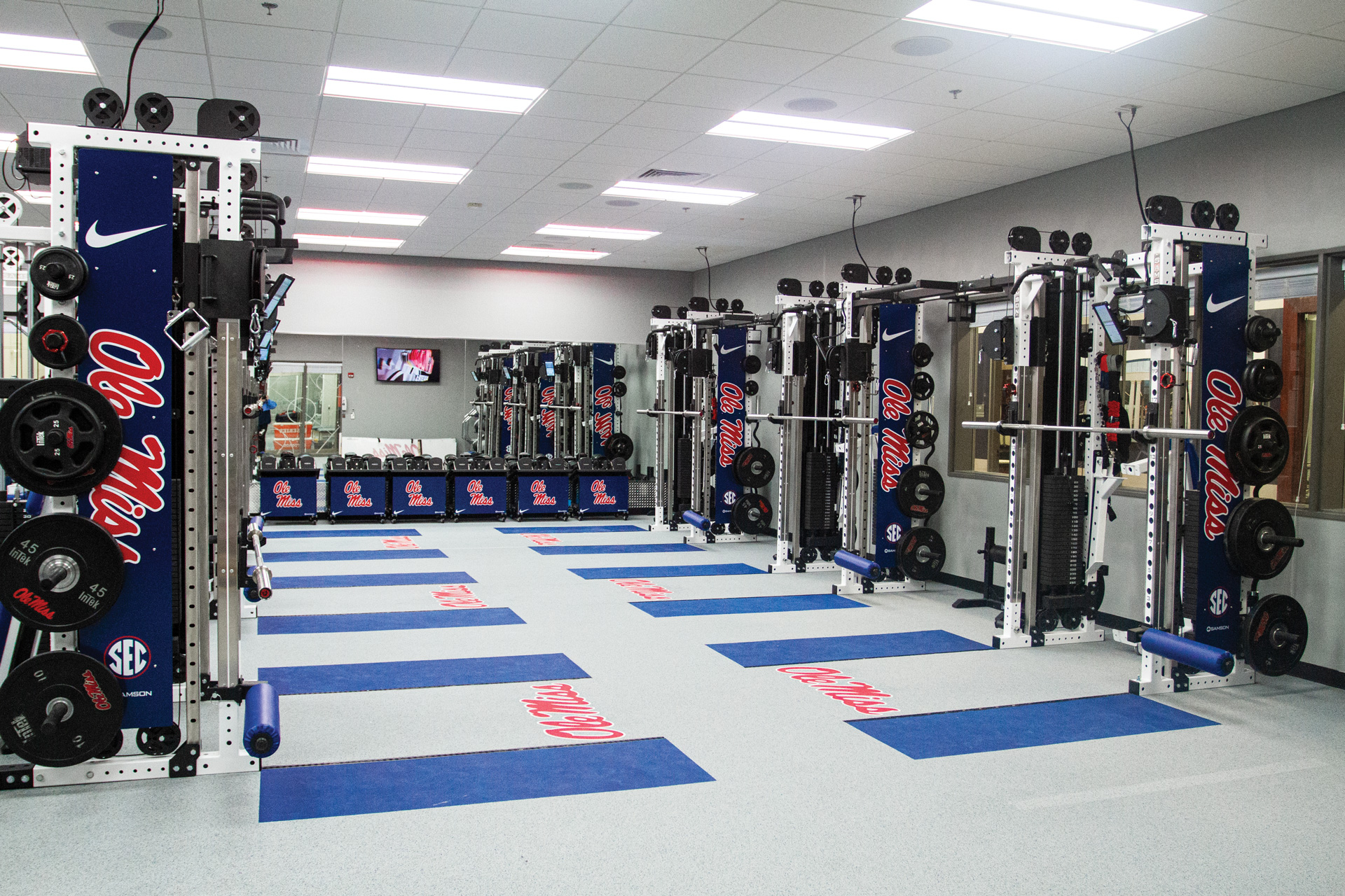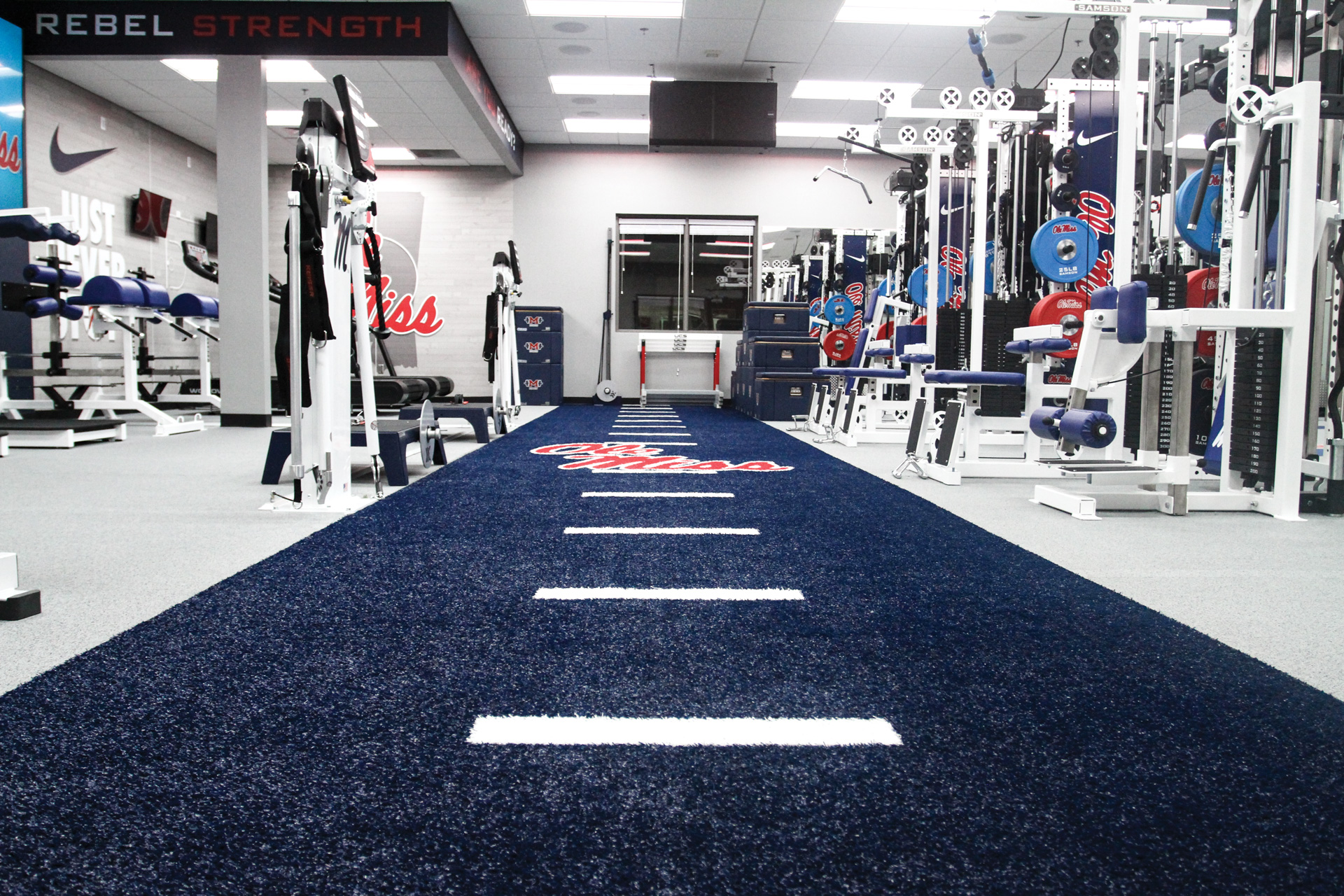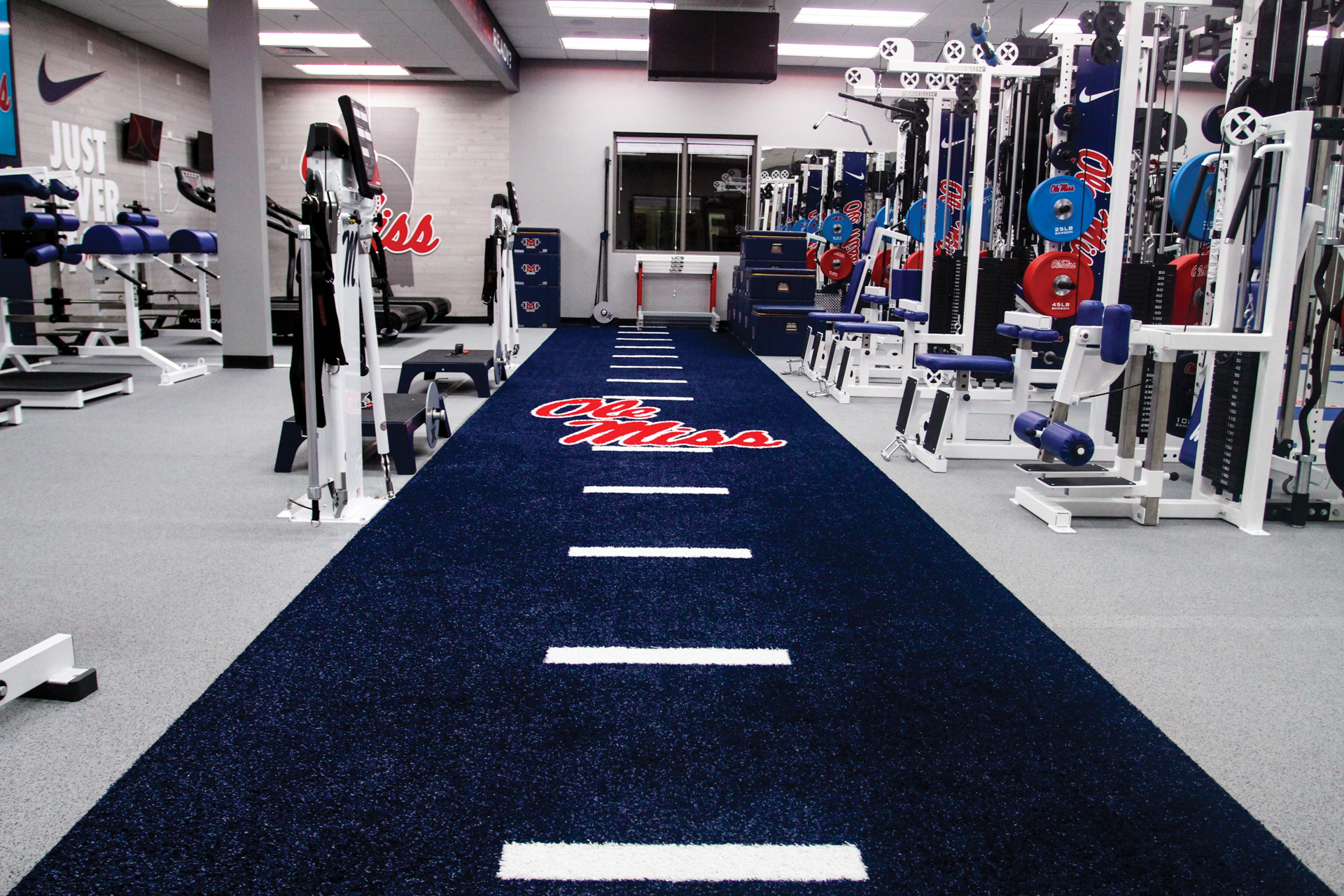 This room features six Samson Flex-Rack Functional Training Racks with Perform-X inlaid systems. Attached to the rear rack stations are Lat-Row Combo Machines and Standing Leg Curl Machines. The room is divided by Ole Miss Branded Turf which separates the lifting stations from the auxiliary and accessory training area. Giving maximal functionality to this performance center. Custom team-branded Samson Urethane Bumper Plates pop off the racks and adds to the pride of Ole Miss.