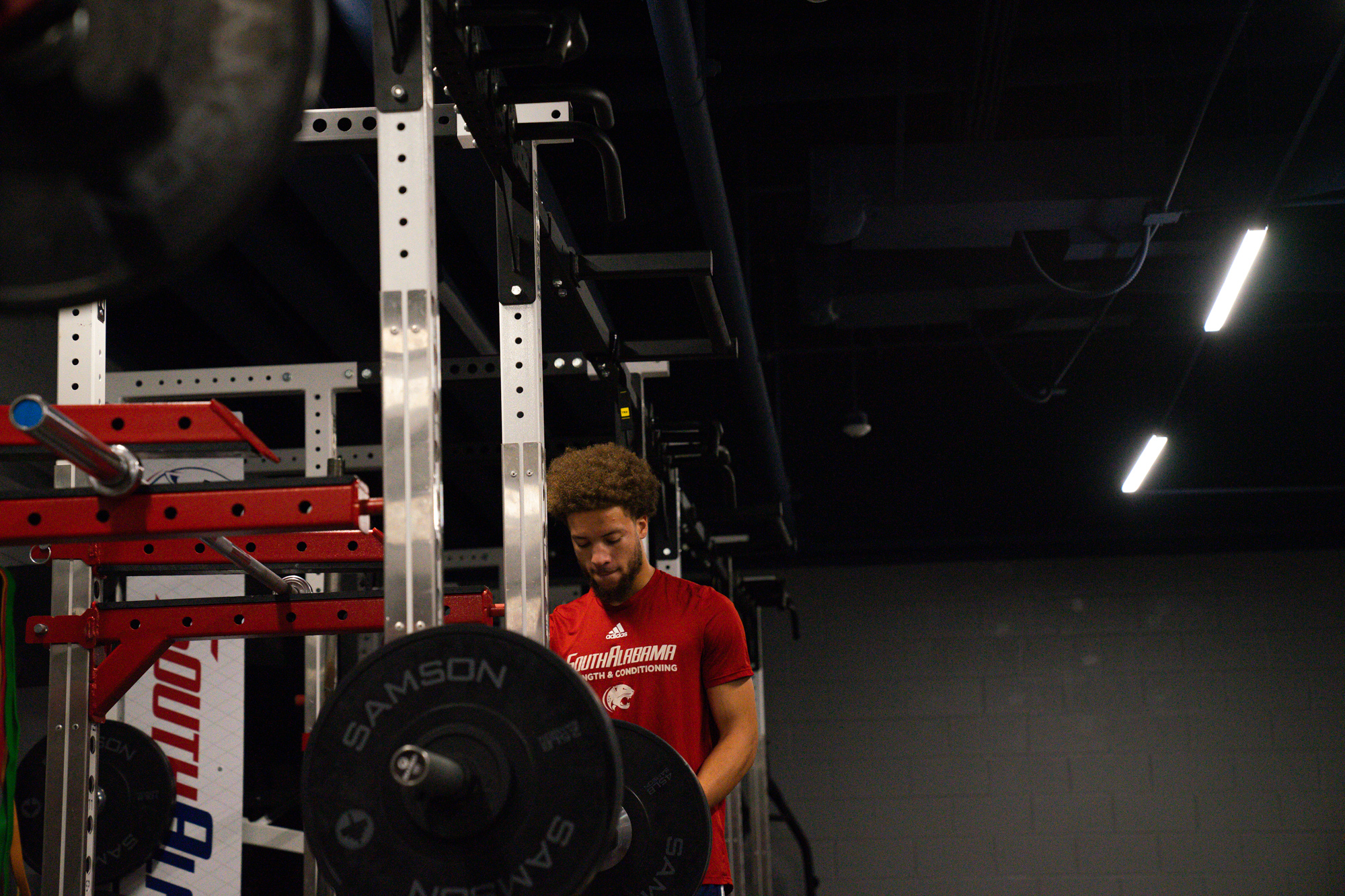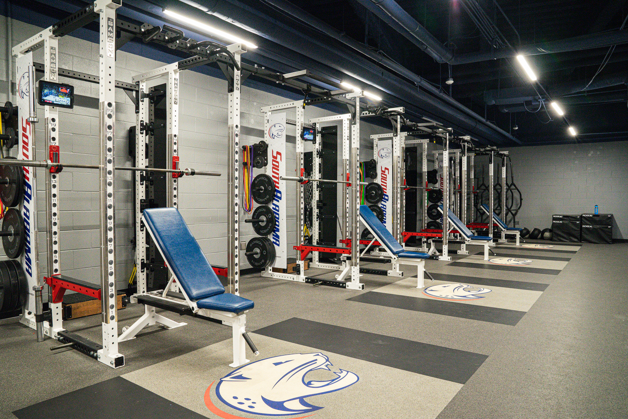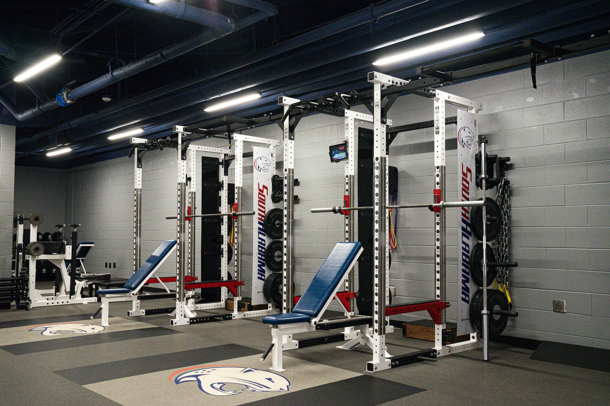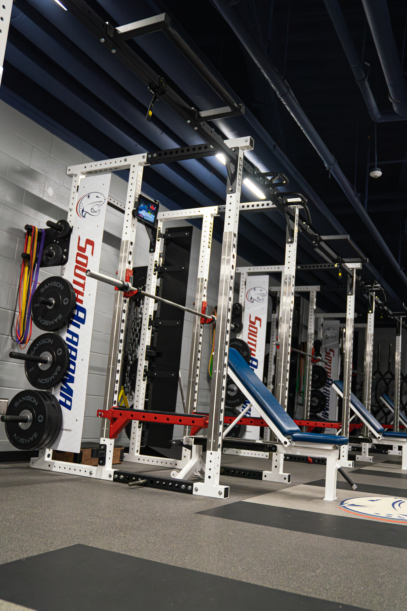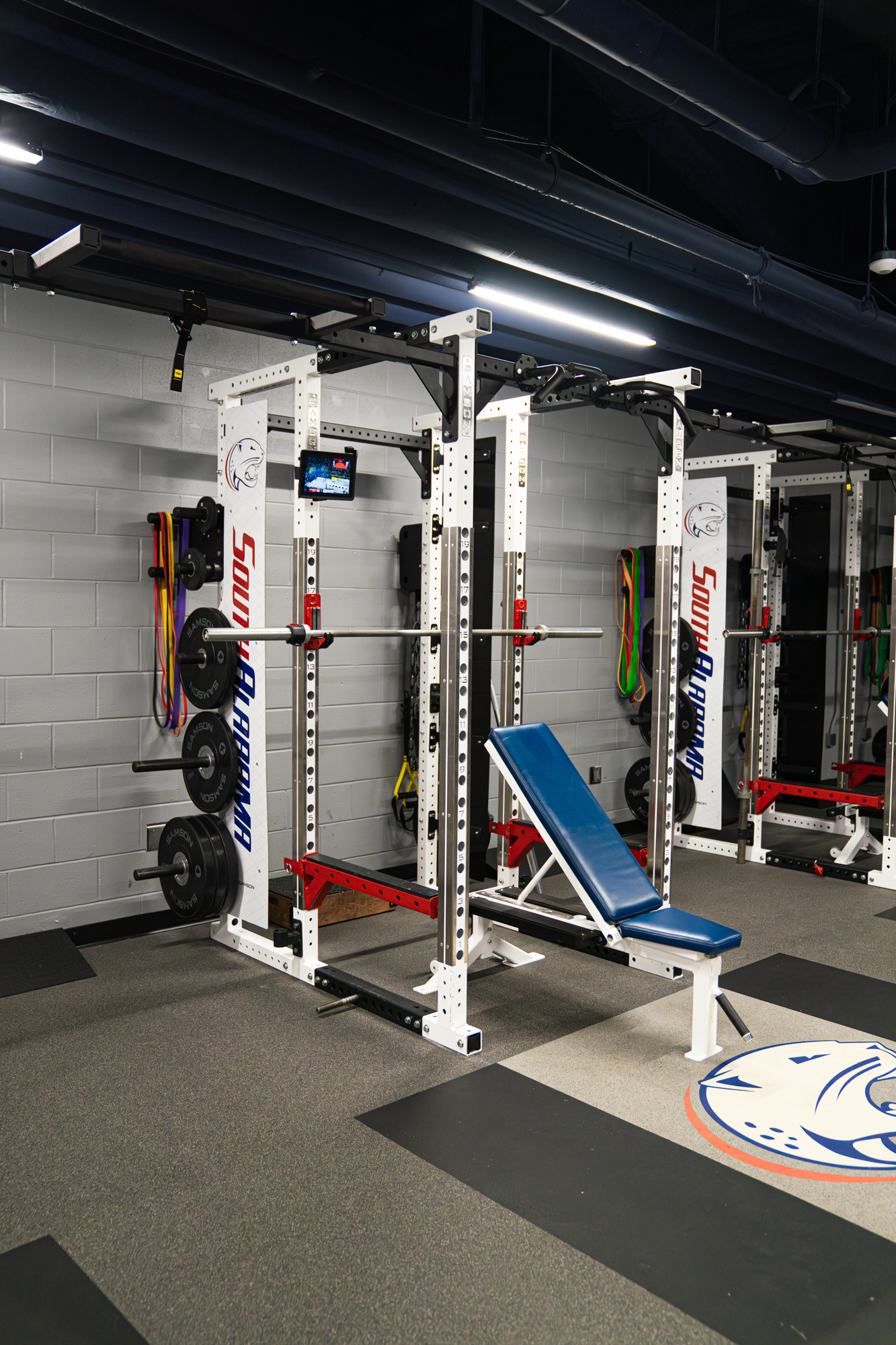 The weight room within The Mitchell Center, despite its modest size and the presence of only 4 racks, stands as a testament to the innovative and strategic approach of the University of South Alabama towards athletic performance and development. This compact space, equipped by Samson Equipment, underscores the university’s commitment to maximizing efficiency and functionality without compromising the quality of training for its men’s and women’s basketball programs.